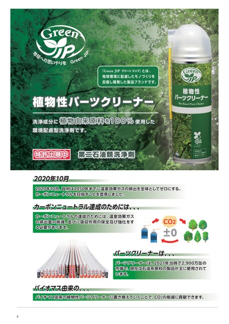 グリーンジップ』とは、『GreenJIP地球環境に配慮したモノづくりを目指し開発した製品ブランドです。植物性パーツクリーナー洗浄成分に使用した植物由来原料を100%環境配慮型洗浄剤です。特許出願中第二石油類洗浄剤2020年10月2020年10月、政府は2050年までに温室効果ガスの排出を全体としてゼロにする、カーボンニュートラルを目指すことを宣言しました。カーボンニュートラル達成のためには、、、カーボンニュートラルの達成のためには、温室効果ガスの排出量の削減、並びに吸収作用の保全及び強化をする必要があります。CO2±0パーツクリーナーは、、、パーツクリーナーは、2021年当時で2,900万缶の市場で、現在は石油系原料の製品が主に使用されています。バイオマス由来の、、、バイオマス由来の植物性パーツクリーナーに置き換えていくことで、CO2の削減に貢献できます。4
