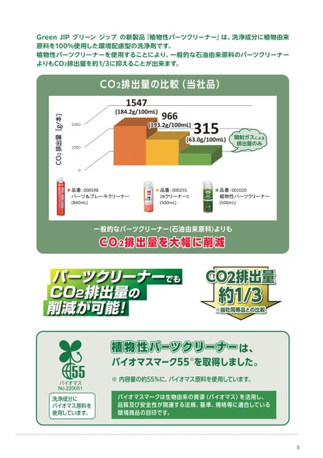 GreenJIPグリーンジップの新製品『植物性パーツクリーナー』は、洗浄成分に植物由来原料を100%使用した環境配慮型の洗浄剤です。植物性パーツクリーナーを使用することにより、一般的な石油由来原料のパーツクリーナーよりもCO2排出量を約1/3に抑えることが出来ます。CO2排出量の比較(当社品)1547(184.2g/100mL)966(193.2g/100mL)315(63.0g/100mL)噴射ガスによる排出量のみ200010000CO2排出量[g/本]000598(840mL)0002552BS(500mL)001020(500mL)一般的なパーツクリーナー(石油由来原料)よりもCO2排出量を大幅に削減パーツクリーナーでもCO2排出量の削減が可能!CO2排出量約1/3※当社同等品との比較植物性パーツクリーナーは、バイオマスマーク55※を取得しました。※内容量の約55%に、バイオマス原料を使用しています。洗浄成分にバイオマス原料を使用しています。バイオマスマークは生物由来の資源(バイオマス)を活用し、品質及び安全性が関連する法規、基準、規格等に適合している環境商品の目印です。5