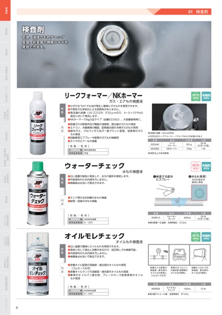 発泡漏れ試験(JIS-Z2329)※025240リークフォーマーノズル(10cm)6本箱に6本入品番025240023362品名リークフォーマーNKホーマー内容量351g15kg消防法上の非危険物入数24本1缶(6本×4箱)●わずかな"もれ"でも泡が発生し簡単にガスもれを発見できます。●不燃性で化学反応による危険性がありません。●発泡漏れ試験(JIS-Z2329)で30μmの穴、4〜5×103Paの差圧において発泡します。●NKホーマー15kg斗缶タイプ(品番023362)。大容量使用時に。●各種ガスの配管系及び機器の溶接部、接合面のガスもれ発見●エアコン、冷蔵庫等の機器、配管接合部の冷媒ガスのもれ発見●都市ガス、プロパンガス及び一般プラント配管、容器等のガスもれ発見●自動車用エアブレーキ配管のガスもれ検査用●タイヤのエアーもれ検査特長用途[性能/性状]外観使用温度範囲無色透明液体常温PRTR該当有機則非該当❷水もれ発見!水もれ部分が緑色に発色❶検査する部分にスプレー●白い塗膜が緑色に発色して、水もれ箇所を検知します。●外部塗布のため内部を汚しません。●検査後は水洗いで除去できます。特長ウォーターチェック水もれ検査液品番000612品名ウォーターチェック内容量420mL入数24本(6本×4箱)第4類第一石油類危険等級Ⅱ210mLPRTR非該当有機則非該当各種オイル配管の溶接部・接合部のオイルもれ発見に(ゴムホースも可)車等のオイルパンの接合部・配管等のオイルもれ発見に各種オイルタンクの溶接部・接合部のオイルもれ発見に品番000659品名オイルモレチェック内容量150mL第4類アルコール類危険等級Ⅱ67.5mL入数12本オイルモレチェックオイルもれ検査液●白い塗膜で簡単にオイルもれを発見できます。●液体に対して吸出し効果があるので、加圧無しでも検査可能。●外部塗布のため内部を汚しません。●検査後は水洗いで除去できます。●各種オイル配管の溶接部・接合部のオイルもれ発見(ゴムホースも可)●各種オイルタンクの溶接部・接合部のオイルもれ発見●車等のオイルパン接合部、ブレーキホース配管部等のオイルもれ発見特長用途[性能/性状]外観使用温度範囲白色粉体塗膜0〜50℃●タンク等の水圧試験の水もれ検査●配管・容器の水もれ検査用途[性能/性状]外観使用温度範囲白色粉体塗膜0〜50℃検査剤気体、液体のもれチェック金属、非金属の微細なキズを発見できます。01検査剤リークフォーマー/NKホーマーガス・エアもれ検査液PRTR非該当有機則非該当検査剤潤滑剤切削油食品工場関連生分解シリーズサビ取り剤防剤特殊塗料接着剤洗浄剤・油処理剤床補修材床塗料・離型剤表面処理剤ステンレス溶接補助剤付着防止剤スパッター開先防剤溶接向上・接合面処理剤インデックス6