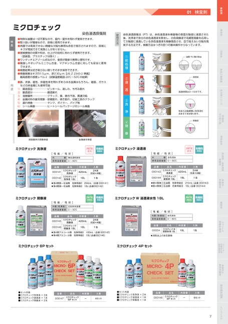 検査剤潤滑剤切削油食品工場関連生分解シリーズ防剤サビ取り剤特殊塗料洗浄剤・油処理剤接着剤床塗料・床補修材離型剤ステンレス表面処理剤スパッター付着防止剤溶接補助剤溶接向上・開先防剤接合面処理剤インデックス油類・サビ類の除去浸透液浸透時間は3〜15分です。布または紙綿類に洗浄液を含ませて拭き取ります。現像液PRTR該当有機則非該当][/能性性状外観使用温度範囲赤色液体0〜80℃01検査剤染色浸透探傷法(PT)は、赤色浸透液を検査物の表面欠陥部に浸透させた後、洗浄液で余分の赤色浸透液を除去し、白色現像液で毛細管現象を応用して欠陥部に浸透している赤色浸透液を現像発色させ、目で見えない欠陥を発見する方法です。検査方法はつぎの四つの基本操作からなっています。使用方法①前処理②浸透③洗浄④現像ミクロチェック染色浸透探傷剤●特殊な装置は一切不要なので、屋内・屋外を問わず使用できます。●取り扱いが簡単なので、容易に使用できます。●肉眼では発見できない微細な欠陥も鮮明な赤色で指示されますので、容易にキズが発見できて見落としがありません。●被検査物の材質や形状、仕上げの如何に拘わらず使用できます。(塗装面、プラスチックは除く)。●ワンタッチエアゾール式なので、使用が簡単で携帯に便利です。●腐食しやすいアルミニウム合金、マグネシウム合金に対しても安全に使用できます。●検査結果は拭き取らない限りそのまま保存できます。●検査感度はキズ巾1.5μm、深さ30μm【JISZ2343-2準拠】最高感度の感度レベル2(試験温度範囲-20℃〜50℃の結果)●鉄、非鉄、磁性、非磁性体を問わずあらゆる金属はもちろん、磁器、ガラスなどの非金属にも使用可能1)鋳造部品………………ピンホール、湯しわ、ちぢみ割れ2)鍛造部分………………鍛造割れ3)溶接箇所………………クラック、巣、接合不良、貫通欠陥4)金属材料の疲労現象…研磨割れ、焼き割れ、切削工具のクラック5)漏れ検査………………タンク、ボイラー、パイプ等6)シール検査……………ヒートシールパッケージのシール検査特長用途溶接箇所の探傷検査金属疲労検査ミクロチェック洗浄液ミクロチェック現像液/[性能性外観使用温度範囲PRTR該当有機則非該当ミクロチェック浸透液]状無色透明液体0〜60℃品番品名000141000142ミクロチェック洗浄液ミクロチェック洗浄液18L内容量420mL入数24本(6本×4箱)18L1缶品番品名000143000144ミクロチェック浸透液ミクロチェック浸透液18L内容量420mL入数24本(6本×4箱)18L1缶第4類第一石油類危険等級Ⅱ294mL(品番000141)第4類第一石油類危険等級Ⅱ18L(品番000142)第4類第三石油類危険等級Ⅲ210mL(品番000143)第4類第三石油類危険等級Ⅲ18L(品番000144)PRTR非該当有機則非該当ミクロチェックW浸透液水性18LPRTR非該当有機則非該当/[性能性外観(乾燥後)使用温度範囲]状白色粉体塗膜0〜50℃品番品名000145000146ミクロチェック現像液ミクロチェック現像液18L内容量420mL入数24本(6本×4箱)18L1缶第4類アルコール類危険等級Ⅱ189mL(品番000145)第4類アルコール類危険等級Ⅱ18L品番000146)[能性/性外観(乾燥後)使用温度範囲]状赤色液体0〜80℃品番000254品名ミクロチェックW浸透液水性18L内容量18L入数1缶消防法上の非危険物ミクロチェック6Pセットミクロチェック4Pセット●セット内容■ミクロチェック洗浄液×3本■ミクロチェック浸透液×1本■ミクロチェック現像液×2本品番品名内容量000147ミクロチェック6Pセットー入数4セット●セット内容■ミクロチェック洗浄液×2本■ミクロチェック浸透液×1本■ミクロチェック現像液×1本品番品名内容量000148ミクロチェック4Pセットー入数6セット7