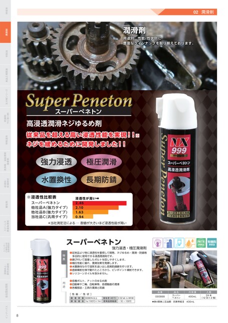 02潤滑剤潤滑剤用途別、性能/性状別に豊富なラインナップを取りえております。SuperPenetonスーパーぺネトン高浸透潤滑ネジゆるめ剤従来品を超える高い浸透性能を実現!!※ネジを緩めるために開発しました!!※浸透性比較表スーパーペネトン他社品A(強力タイプ)他社品B(強力タイプ)当社品C(汎用タイプ)浸透性が高い➡2.462.101.630.94*当社測定法による…数値が大きいほど浸透性能が高いPRTR非該当有機則非該当品番000999品名スーパーペネトン内容量400mL入数24本(12本×2箱)強力浸透・極圧潤滑剤●従来品より特に浸透性を重視して開発、ネジゆるめ・潤滑・防等多目的に使用できる浸透潤滑剤です。●び付いて固着したボルトを回しやすくします。●極圧性能に優れ、潤滑効果を発揮します。●水置換性なので湿気を追い出し長期防膜を作ります。●直線噴射仕様で離れたところから、ピンポイント噴射できます。●シリコーンオイルを含みません。スーパーペネトン特長●各種ボルト、ナットのゆるめ剤●自動車や二輪、自転車等、各動面の潤滑●各種部品・工具の潤滑と防用途[性能/性状]融銅着板荷腐重食86080N以上1a(100℃×1hr)使用温度範囲動粘度(40℃)2.02㎟/s(参考値)-10〜130℃第4類第二石油類危険等級Ⅲ400mL検査剤潤滑剤切削油食品工場関連生分解シリーズサビ取り剤防剤特殊塗料接着剤洗浄剤・油処理剤床補修材床塗料・離型剤表面処理剤ステンレス溶接補助剤付着防止剤スパッター開先防剤溶接向上・接合面処理剤インデックス