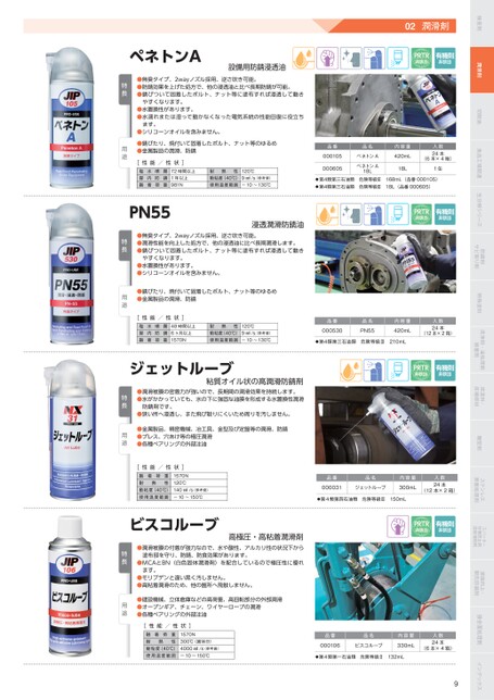 検査剤潤滑剤切削油食品工場関連生分解シリーズ防剤サビ取り剤特殊塗料洗浄剤・油処理剤接着剤床塗料・床補修材離型剤ステンレス表面処理剤スパッター付着防止剤溶接補助剤溶接向上・開先防剤接合面処理剤インデックスペネトンA設備用防浸透油02潤滑剤PRTR非該当有機則非該当●無臭タイプ、2wayノズル採用、逆さ吹き可能。●防効果を上げた処方で、他の浸透油と比べ長期防が可能。●びついて固着したボルト、ナット等に塗布すれば浸透して動きやすくなります。●水置換性があります。●水濡れまたは湿って動かなくなった電気系統の性能回復に役立ちます。●シリコーンオイルを含みません。●びたり、焼付いて固着したボルト、ナット等のゆるめ●金属製品の潤滑、防[性能/性状]塩屋融水内着噴防荷霧重72時間以上1年以上981N性熱120℃耐動粘度(40℃)9㎟/s(参考値)使用温度範囲-10〜130℃品番品名000105ペネトンA000605ペネトンA18L内容量420mL18L入数24本(6本×4箱)1缶第4類第三石油類危険等級Ⅲ168mL(品番000105)第4類第三石油類危険等級Ⅲ18L(品番000605)特長用途PN55浸透潤滑防油PRTR非該当有機則非該当品番000530品名PN55内容量420mL入数24本(12本×2箱)第4類第三石油類危険等級Ⅲ210mLPRTR非該当有機則非該当品番品名000031ジェットルーブ内容量300mL入数24本(12本×2箱)第4類第四石油類危険等級Ⅲ150mLPRTR非該当有機則非該当●無臭タイプ、2wayノズル採用、逆さ吹き可能。●潤滑性能を向上した処方で、他の浸透油に比べ長期潤滑します。●びついて固着したボルト、ナット等に塗布すれば浸透して動きやすくなります。●水置換性があります。●シリコーンオイルを含みません。●びたり、焼付いて固着したボルト、ナット等のゆるめ●金属製品の潤滑、防[性能/性状]塩屋融水内着噴防荷霧重48時間以上6ヶ月以上1570N性熱120℃耐動粘度(40℃)9㎟/s(参考値)使用温度範囲-10〜130℃特長用途ジェットルーブ粘質オイル状の高潤滑防剤●潤滑被膜の密着力が強いので、長期間の潤滑効果を持続します。●水がかかっていても、水の下に強固な油膜を形成する水置換性潤滑防剤です。●狭い所へ浸透し、また飛び散りにくいため周りを汚しません。●金属製品、精密機械、冶工具、金型及び定盤等の潤滑、防●プレス、穴あけ等の極圧潤滑●各種ベアリングの外部注油[性能/荷性重性熱着融耐動粘度(40℃)使用温度範囲状]1570N120℃140㎟/s(参考値)-10〜150℃特長用途高極圧・高粘着潤滑剤●潤滑被膜の付着が強力なので、水や酸性、アルカリ性の状況下から塗布部を守り、防、防食効果があります。●MCAとBN(白色固体潤滑剤)を配合しているので極圧性に優れます。特長●モリブデンと違い黒く汚しません。●高粘着潤滑のため、他の箇所へ飛散しません。ビスコルーブ[性能/荷性重性熱着融耐動粘度(40℃)使用温度範囲状]1570N300℃(固体分)4000㎟/s(参考値)-10〜150℃品番品名000106ビスコルーブ内容量330mL入数24本(6本×4箱)第4類第一石油類危険等級Ⅱ132mL9●建設機械、立体倉庫などの高荷重、高回転部分の外部潤滑●オープンギア、チェーン、ワイヤーロープの潤滑●各種ベアリングの外部注油用途