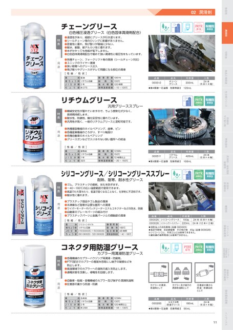検査剤潤滑剤切削油食品工場関連生分解シリーズ防剤サビ取り剤特殊塗料洗浄剤・油処理剤接着剤床塗料・床補修材離型剤ステンレス表面処理剤スパッター付着防止剤溶接補助剤溶接向上・開先防剤接合面処理剤インデックス内容量100g入数シリコーングリースシリコーングリーススプレー000025000026消防法上の非危険物(品番000025)指定可燃物合成樹脂類その他の物45g(品番000026)※シリコーンゴム、天然ゴムには使用できません。※鋼対鋼の境界潤滑には使用できません。24本(6本×4箱)24本(12本×2箱)220mLPTFE配合PRTR非該当有機則非該当カプラーの潤滑、防湿剤としてカプラー及び端子の潤滑防湿剤として圧着部の裏から防湿・防目的として品番000285品名コネクタ用防湿グリース内容量180mL入数24本(6本×4箱)第4類第一石油類危険等級Ⅱ90mL1102潤滑剤PRTR該当有機則非該当チェーングリース白色極圧浸透グリース(白色固体潤滑剤配合)●浸透性があり、細部にグリースが行き渡ります。●シールチェーン等のOリングに影響がありません。●密着性に優れ、飛び散りが極端に少ない。●耐水、耐酸、耐アルカリ性に優れます。●水がかかっても性能が低下しません。●白色固体潤滑剤配合で極めて強い潤滑性と極圧性をもっています。●各種チェーン、フォークリフト等の潤滑(シールチェーン対応)●ユニックのワイヤー潤滑●狭い間へのグリース注入●飛び散りやグリースがタレて問題になる部位の潤滑特長用途[性能/基増Jちちょう分IうSょ性油剤類度]状鉱油リチウム石鹸2号約275熱荷着重融性耐塩霧使用温度範囲水噴1961N100℃120時間-15〜120℃品番000512品名チェーングリース内容量300mL入数24本(6本×4箱)第4類第一石油類危険等級Ⅱ120mLPRTR非該当有機則非該当リチウムグリース汎用グリーススプレー●機械安定性が優れていますので、ちょう度軟化が少なく、長時間持続します。●耐水性、防性、酸化安定性に優れています。●汎用性が高く、一般のリチウムグリースと混和可能です。●各種建設機械のホイルベアリング、歯車、ピン●各種産業機械のころがり、すべり軸受け●各種自動車のホイルベアリング●グリースガンなどで入りきれない狭い箇所への給油特長用途[性能/基増Jちちょう分IうSょ性油剤類度状]鉱物油リチウム石鹸1号323熱荷着重融性耐塩霧使用温度範囲水噴1236N150℃72時間以上-20〜150℃品番000511品名リチウムグリース内容量420mL入数24本(6本×4箱)第4類第一石油類危険等級Ⅱ168mLシリコーングリース/シリコーングリーススプレー耐熱、耐寒、耐水性グリースPRTR非該当有機則非該当品番品名●ゴム、プラスチックの磨耗、劣化を防ぎます。●-40〜180℃の広い温度範囲で使用できます。●高温でたれ落ちたり、低温で固くなることなく、化学的に不活性です。●耐水性に優れます。●プラスチック部品やゴム製品の潤滑●冷凍庫など耐寒が必要な箇所への潤滑●ワイパーモーターやバッテリーターミナルコネクターなどの防水、防●自動車のブレーキパーツの組み付け●プラスチックパーツと金属パーツとの動部の潤滑特長用途[性能/基油増ちょう剤類JISちょう度分]状性融シリコーンオイル耐リチウム石鹸2号(000025)/1号(000026)塩260(000025)/320(000026)荷着熱重性霧使用温度範囲水噴―180℃48時間-40〜180℃コネクタ用防湿グリースカプラー用潤滑防湿グリース●各種機械のカプラーハウジング用潤滑・防剤。●PTFE配合でカプラーの着脱を容易にし端子の破損などを防止します。●高湿環境でのカプラーへの湿気の進入を防止します。●通電状態を改善し、導電性を回復します。●自動車・船舶・各種機械のカプラー及び端子の潤滑防湿剤●圧着部の裏から防湿・防特長用途[性能/基増Jちちょう分IうSょ性油剤類度状]合成油リチウム石鹸2号約290熱荷着重融性耐塩霧使用温度範囲水噴1236N130℃120時間以上-55〜130℃