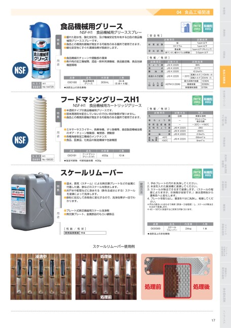 検査剤潤滑剤切削油食品工場関連生分解シリーズ防剤サビ取り剤特殊塗料洗浄剤・油処理剤接着剤床塗料・床補修材離型剤ステンレス表面処理剤スパッター付着防止剤溶接補助剤溶接向上・開先防剤接合面処理剤インデックス食品機械用グリースNSF-H1食品機械用グリーススプレー●優れた耐水性、酸化安定性、及び機械安定性を有する白色の食品機械用グリーススプレーです。●食品との偶発的接触が発生する可能性のある箇所で使用できます。●酸化安定性にすぐれ潤滑効果が長続きします。●食品機械のチェーンや動部の潤滑●魚や肉の加工機械類、酒造・飲料充填機械、食品搬送機、食品包装機器類等04食品工場関連PRTR非該当有機則非該当[安全性]材質試溶出試験験試験項目鉛カドミウム重金属試験結果1ppm以下1ppm以下1ppm以下(Pbとして)過マンガン酸カリウム消費量0.5ppm以下[/性能性試験項目ち滴離ょう油度点度状]試験方法JISK2220JISK2220JISK2220試験結果365217℃10.2wt%品番000188品名食品機械用グリース消防法上の非危険物内容量300mL入数24本(6本×4箱)低温トルク試験JISK2220-20℃起動トルク回転トルクシ四ェ球ル試式験ASTMD2596最大非焼付加重融着荷重荷重磨耗指数110mN・m20mN・m1236N3090N578N[性状]/性能試験項目試験方法色増使混滴離基動調剤囲度点度ちょう用和温ち度ょ範う油油度粘40℃100℃目視ーーJISK2220JISK2220JISK2220JISK2220PRTR非該当有機則非該当性状微黄半透明アルミニウム複合石鹸-20℃〜+180℃280256℃2.9wt%68mm2/s9mm2/sPRTR非該当有機則非該当フードマシングリースH1NSF-H1食品機械用カートリッジグリース●半透明タイプの食品機械用グリースです。●固体潤滑剤を配合していないので白い粉状物質が残りません。●食品との偶発的接触が発生する可能性のある箇所で使用できます。特長●ミキサーやスライサー、魚解体機、すり身機等、食品製造機械全般のギア・チェーン駆動部、軸受部、動部●各種海産物加工機械のメンテナンス●食品、医療品、化粧品の製造機械や包装機器用途SNF登録番号H1No.156530品番000181品名フードマシングリースH1内容量400g指定可燃物可燃性固体類400g入数10本スケールリムーバーさい。※汚れの度合いに合わせて希釈(原液〜3倍程度)し、スケールが除去されるまで浸漬します。※40〜50℃に加温すると洗浄力が強くなります。1.予めプレートの汚れを洗浄してください。2.本液を入れた薬液槽に浸漬してください。3.スケールが除去できるまで浸漬します。(スケールの程度によりますが、8時間が目安です。)液は透明色から濃紫色へと変化します。4.プレートを取り出し、薬液を十分に洗浄し、乾燥してくだ使用方法品番000569品名スケールリムーバー消防法上の非危険物内容量24kg入数1本17●温水、蒸気(スチーム)による熱交換プレートなどの金属に付着した、鉄などのスケールを除去します。●井戸水や配管などに含まれる(鉄を主成分とする)スケールを浸漬によって洗浄します。●鉄粉に反応して赤紫色に変化するので、洗浄効果が一目でわかります。●プレート式熱交換器用スケール洗浄剤●熱交換プレート、金属部品のもらい除去[性能/性使用温度範囲]状常温特長用途スケールリムーバー使用例浸漬中処理後処理前特長用途SNF登録番号H1No.144729