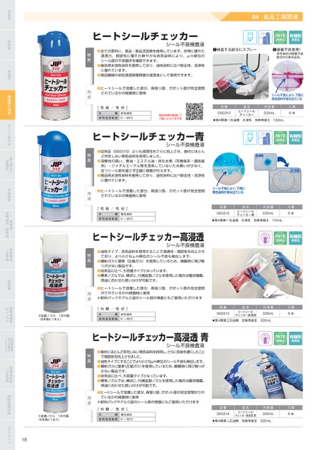 ヒートシールチェッカーシール不良検査液●全ての原料に、食品・食品添加物を使用しています。非常に優れた浸透力、視認性に優れた鮮やかな赤色染料により、μm単位のシール部の不良箇所を確認できます。●食品用水溶性染料を使用しており、油性染料に比べ除去性、洗浄性に優れています。●食品機械の染色浸透探傷検査の浸透液として使用できます。04食品工場関連❶検査する部分にスプレーPRTR非該当有機則非該当❷接着不良発見!赤色染料が接着不良部分から滲み出る。●ヒートシールで溶着した部分、背張り部、ガゼット部が完全密閉されているかの検査時に使用[性能/性状]外観使用温度範囲赤色液体0〜80℃商品詳細を動画にてご覧いただけます▶品番000310品名ヒートシールチェッカー内容量220mL入数6本第4類第一石油類水溶性危険等級Ⅱ132mLPRTR非該当有機則非該当●ヒートシールで溶着した部分、背張り部、ガゼット部が完全密閉されているかの検査時に使用[性能/性状]外観使用温度範囲青色液体0〜80℃品番000312品名ヒートシールチェッカー青内容量220mL入数6本第4類第一石油類水溶性危険等級Ⅱ110mLPRTR非該当有機則非該当内容量320mL入数6本品番000313品名ヒートシールチェッカー高浸透第4類第三石油類危険等級Ⅲ320mLPRTR非該当有機則非該当ヒートシールチェッカー青シール不良検査液●従来品(000310)よりも浸透性をさらに向上させ、食材にほとんど存在しない青色染料を採用しました。●溶解性の高い、香油・エステル油・炭化水素(芳香族系・脂肪族系)・ジメチルエーテル等を含有していないため臭いが少なく、且つシール部を侵さず正確に検査が行えます。●食品用水溶性染料を使用しており、油性染料に比べ除去性・洗浄性に優れています。ヒートシールチェッカー高浸透シール不良検査液●油性タイプ、赤色染料を使用することで浸透性・視認性を向上させており、より小さなμm単位のシール不良も検出します。●噴射ガスに窒素(圧縮ガス)を使用しているため、噴霧時に飛び散りが少ない製品です。●従来品に比べ、大容量タイプとなっています。●標準ノズルでは、棒状に、付属拡散ノズルを使用した場合は霧状噴霧。用途に合わせた使い分けが可能です。●ヒートシールで溶着した部分、背張り部、ガゼット部の完全密閉がされているかの検査時に使用※飲料パックやアルミ袋のシール部の検査にもご使用いただけますヒートシールチェッカー高浸透青シール不良検査液●食材にほとんど存在しない青色染料を採用し、さらに色味を濃くしたことで視認性を向上させました。●油性タイプにすることでより小さなµm単位のシール不良も検出します。●噴射ガスに窒素(圧縮ガス)を使用しているため、噴霧時に飛び散りが少ない製品です。●従来品に比べ、大容量タイプとなっています。●標準ノズルでは、棒状に、付属拡散ノズルを使用した場合は霧状噴霧。用途に合わせた使い分けが可能です。●ヒートシールで溶着した部分、背張り部、ガゼット部の完全密閉がされているかの検査時に使用※飲料パックやアルミ袋のシール部の検査にもご使用いただけます特長用途特長用途特長用途特長用途※拡散ノズル1本付属(6本箱に1本入)[外観/性状]外観使用温度範囲赤色液体0〜80℃※拡散ノズル1本付属(6本箱に1本入)[外観/性状]外観使用温度範囲青色液体0〜80℃18品番000314品名ヒートシールチェッカー高浸透青内容量320mL入数6本第4類第二石油類危険等級Ⅲ320mL検査剤潤滑剤切削油食品工場関連生分解シリーズサビ取り剤防剤特殊塗料接着剤洗浄剤・油処理剤床補修材床塗料・離型剤表面処理剤ステンレス溶接補助剤付着防止剤スパッター開先防剤溶接向上・接合面処理剤インデックス