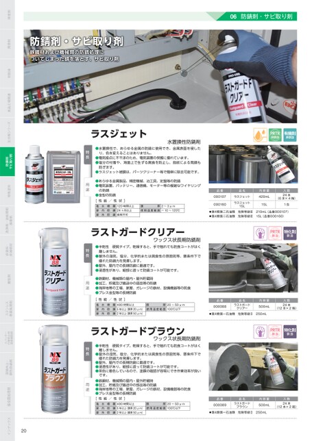 PRTR非該当有機則非該当品番000107000160品名ラスジェットラスジェット15L内容量420mL15L入数24本(6本×4箱)1缶第4類第二石油類危険等級Ⅲ210mL(品番000107)第4類第二石油類危険等級Ⅲ15L(品番000160)PRTR該当特化則該当品番000088品名ラストガードクリアー内容量500mL入数24本(12本×2箱)第4類第一石油類危険等級Ⅱ250mLPRTR該当特化則該当ラスジェット水置換性防剤●水置換性で、あらゆる金属の防に使用でき、金属表面を侵したり、色を変えることはありません。●電気接点に不干渉のため、電気装置の保護に優れています。●塩分の付着や、海面上で生ずる腐食を防止し、指紋による発も防ぎます。●ラスジェット被膜は、パーツクリーナー等で簡単に除去可能です。●あらゆる金属製品、精密機械、冶工具、定盤等の防●電気装置、バッテリー、通信機、モーター等の複雑なワイヤリングの防●金型の防[性能/性状]塩屋屋水内外噴防防霧120時間以上24ヶ月以上使用不可膜厚使用温度範囲2〜3μm-10〜120℃特長用途特長用途ラストガードクリアーワックス状長期防剤●半乾性硬質タイプ。乾燥すると、手で触れても防食コートがはく離しません。●屋外の湿気、塩分、化学的または腐食性の雰囲気等、悪条件下で優れた防力を発揮します。●屋外、屋内での長期防に最適です。●浸透性があり、細部に渡って防コートが可能です。●鉄鋼材、機械類の屋内・屋外貯蔵時●加工、貯蔵及び搬送中の部品等の防●海岸地帯の工場、家屋、ガレージの鉄材、設備機器等の防食●プレス金型等の長期防[性能/性状]塩屋屋水内外噴防防霧480時間以上5年以上(膜厚20μm)2年以上(膜厚50μm)厚膜使用温度範囲20〜50μm100℃以下ラストガードブラウンワックス状長期防剤●半乾性硬質タイプ。乾燥すると、手で触れても防食コートがはく●屋外の湿気、塩分、化学的または腐食性の雰囲気等、悪条件下で優れた防力を発揮します。●屋外、屋内での長期防に最適です。●浸透性があり、細部に渡って防コートが可能です。●茶色に着色しているので、塗膜の確認が容易にでき作業効率が良いです。離しません。特長品番000089品名ラストガードブラウン内容量500mL入数24本(12本×2箱)第4類第一石油類危険等級Ⅱ250mL●鉄鋼材、機械類の屋内・屋外貯蔵時●加工、貯蔵及び搬送中の部品等の防●海岸地帯の工場、家屋、ガレージの鉄材、設備機器等の防食●プレス金型等の長期防用途[性能/性状]塩屋屋水内外噴防防霧480時間以上5年以上(膜厚20μm)2年以上(膜厚50μm)膜厚使用温度範囲20〜50μm100℃以下防剤・サビ取り剤鉄鋼材および機械類の防処理についてしまったを落とす、サビ取り剤06防剤・サビ取り剤検査剤潤滑剤切削油食品工場関連生分解シリーズサビ取り剤防剤特殊塗料接着剤洗浄剤・油処理剤床補修材床塗料・離型剤表面処理剤ステンレス溶接補助剤付着防止剤スパッター開先防剤溶接向上・接合面処理剤インデックス20