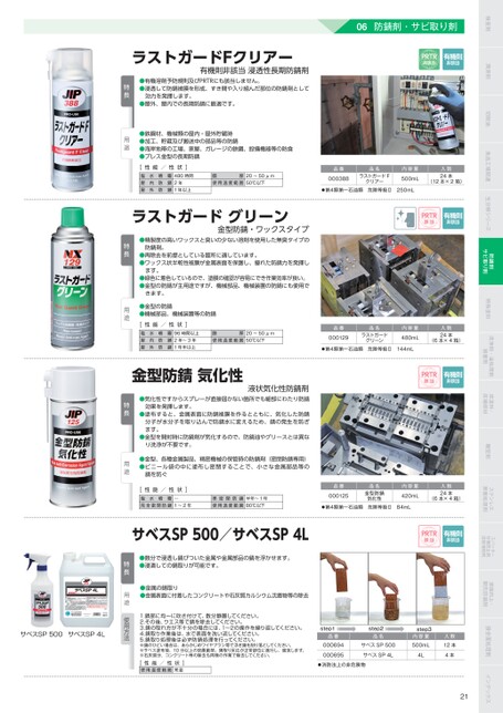 検査剤潤滑剤切削油食品工場関連生分解シリーズ防剤サビ取り剤特殊塗料洗浄剤・油処理剤接着剤床塗料・床補修材離型剤ステンレス表面処理剤スパッター付着防止剤溶接補助剤溶接向上・開先防剤接合面処理剤インデックス第4類第一石油類危険等級Ⅱ144mLPRTR該当有機則非該当品番000125品名金型防気化性内容量420mL入数24本(6本×4箱)第4類第一石油類危険等級Ⅱ84mLPRTR該当有機則非該当step1品番000694000695step2品名サベスSP500サベスSP4L消防法上の非危険物step3内容量500mL4L入数12本4本21第4類第一石油類危険等級Ⅱ250mLPRTR該当有機則非該当ラストガードFクリアー有機則非該当浸透性長期防剤06防剤・サビ取り剤PRTR非該当有機則非該当●有機溶剤予防規則及びPRTRにも該当しません。●浸透して防被膜を形成、すき間や入り組んだ部位の防剤として効力を発揮します。●屋外、屋内での長期防に最適です。●鉄鋼材、機械類の屋内・屋外貯蔵時●加工、貯蔵及び搬送中の部品等の防●海岸地帯の工場、家屋、ガレージの鉄鋼、設備機器等の防食●プレス金型の長期防特長用途[性能塩屋屋水内外/噴防防性霧状]480時間2年1年以上膜厚使用温度範囲20〜50μm50℃以下品番000388品名ラストガードFクリアー内容量500mL入数24本(12本×2箱)膜厚使用温度範囲20〜50μm50℃以下品番000129品名ラストガードグリーン内容量480mL入数24本(6本×4箱)ラストガードグリーン金型防・ワックスタイプ●精製度の高いワックスと臭いの少ない溶剤を使用した無臭タイプの●再除去を前提としている箇所に適しています。●ワックス状半乾性被膜が金属表面を保護し、優れた防力を発揮し●緑色に着色しているので、塗膜の確認が容易にでき作業効率が良い。●金型の防が主用途ですが、機械部品、機械装置の防にも使用で防剤。ます。きます。●金型の防●機械部品、機械装置等の防[性能塩屋屋水内外/噴防防性霧状]96時間以上2年〜3年1年半以上金型防気化性液状気化性防剤●気化性ですからスプレーが直接届かない箇所でも細部にわたり防効果を発揮します。●塗布すると、金属表面に防被膜を作るとともに、気化した防分子が水分子を取り込んで防水に変えるため、の発生を防ぎます。●金型を開封時に防剤が気化するので、防油やグリースとは異なり洗浄が不要です。●金型、各種金属製品、精密機械の保管時の防剤(密閉防専用)●ビニール袋の中に塗布し密閉することで、小さな金属部品等のを防ぐ[性能/噴性塩霧完全密閉防水状]―1〜2年防閉密準使用温度範囲半年〜1年80℃以下特長用途特長用途サベスSP500/サベスSP4L●数分で浸透しびついた金属や金属部品のを浮かせます。●浸漬しての取りが可能です。●金属の取り●金属表面に付着したコンクリートや石灰質カルシウム沈着物等の除去1.部に均一に吹き付けて、数分静置してください。2.その後、ウエス等でを除去してください。3.の取れ方が不十分の場合には、1〜2の操作を繰り返してください。4.取り作業後は、水で表面を洗い流してください。5.取り処理後は必ず防処理を行ってください。※のひどい場合は、あらかじめワイヤブラシ等で浮きを削り落としてください。※サベス塗布後、10分以上の放置厳禁。取り反応が正常部位に進行し、腐食します。※石灰質分、コンクリート等の除去も同様の作業で除去してください。特長用途使用方法サベスSP500サベスSP4L[/能性性使用温度範囲]状常温