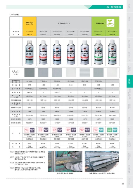 検査剤潤滑剤切削油食品工場関連生分解シリーズ防剤サビ取り剤特殊塗料洗浄剤・油処理剤接着剤床塗料・床補修材離型剤ステンレス表面処理剤スパッター付着防止剤溶接補助剤溶接向上・開先防剤接合面処理剤インデックス07特殊塗料[スペック表]高濃度ジンクリッチタイプ光沢シルバータイプ環境対応タイプ製品品名品番ジンクコート000130クリンジンキジンクコートSAクリンジンキLクリンジンキHLクリンジンキFクリンジンキLF0709770001370723510723600004530004381.751.251.58塩水噴霧500時間以上200時間以上400時間以上屋膜外放※注2置厚2年以上15〜25μm密着性基盤目試験100/100上塗り適正※注3指触乾燥20℃(目安)硬塗化乾布面※注4燥積○約5分7時間ー5〜15μm100/100×約5分7時間2年以上15〜25μm100/100×約10分8時間0.93ーー5〜15μm100/100×約15分24時間0.98ーー5〜15μm100/100×約10分12時間1.60200時間以上ー15〜25μm100/100×約10分12時間ー0.88ーー5〜10μm100/100×約10分12時間塗膜カラーイメージ※注1乾燥塗膜中の亜粉鉛液比重84%以上77.5%以上73%以上10.9%以上15.0%以上77.6%以上0.4〜0.6㎡0.2〜0.3㎡0.4〜0.6㎡0.8〜1.2㎡1.5〜2.0㎡0.4〜0.6㎡1.4〜1.6㎡耐熱性(短時間)180℃180℃180℃180℃耐熱性(長時間)150℃以下150℃以下150℃以下150℃以下100℃80℃以下100℃80℃以下100℃80℃以下法内入令量数容PRTR該当特化則該当PRTR該当特化則該当PRTR該当特化則該当PRTR該当特化則該当PRTR該当特化則該当PRTR該当有機則非該当PRTR非該当有機則非該当第4類第二石油類168mL第4類第二石油類168mL第4類第二石油類180mL第4類第一石油類189mL第4類第一石油類210mL第4類第一石油類168mL第4類第一石油類210mL危険等級Ⅲ危険等級Ⅲ危険等級Ⅲ危険等級Ⅱ危険等級Ⅱ危険等級Ⅱ危険等級Ⅱ450g24本(6本×4箱)420mL24本(12本×2箱)420mL24本(6本×4箱)420mL24本(12本×2箱)420mL24本(12本×2箱)420mL24本(6本×4箱)420mL24本(6本×4箱)※注1印刷上の表現であって実際の色合いと異なる場合があります。※注21回塗りでの目安です。塗布速度、距離等で違いがあります。※注3フタル酸系塗料は層間剥離する恐れがあるので避けてください。※注4膜厚30〜40μmとして算出しています。塗り方によりかなりの差があります。建設用足場の防食補修溶融亜鉛メッキの光沢シルバー補修25