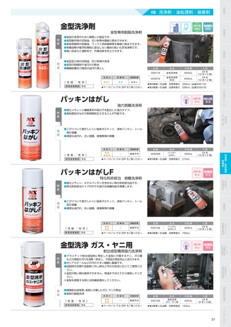 検査剤潤滑剤切削油食品工場関連生分解シリーズ防剤サビ取り剤特殊塗料洗浄剤・油処理剤接着剤床塗料・床補修材離型剤ステンレス表面処理剤スパッター付着防止剤溶接補助剤溶接向上・開先防剤接合面処理剤インデックス08洗浄剤・油処理剤・接着剤金型洗浄剤金型専用脱脂洗浄剤(000619のみ)PRTR非該当有機則非該当品番000119000619品名金型洗浄剤金型洗浄剤840内容量500mL840mL入数24本24本(12本×2箱)(12本×2箱)第4類第一石油類危険等級Ⅱ350mL(品番000119)第4類第一石油類危険等級Ⅱ588mL(品番000619)PRTR該当特化則該当●金型の洗浄のために開発した製品です。●金型製作時の切削油、切り粉等を簡単に除去できます。●金型保管時の防油、ワックス系防剤等を簡単に除去できます。●有機溶剤中毒予防規則に該当しない毒性の低い化学洗浄剤です。●強い洗浄力と速乾性で、作業効率を向上させます。特長●金型加工時の切削油、切り粉等の洗浄●金型の防剤や油汚れの除去●機械設備及び部品の油汚れ落とし用途[性能/性状]使用温度範囲常温洗浄力★★★乾燥性★★樹脂影響★★★★マークについては28Pをご覧ください。パッキンはがし強力剥離洗浄剤●塩化メチレンと繊維素系の高分子を配合した強力タイプ。●高粘度処方なので長時間反応させることが可能です。●こびりついて剥がしにくい固体ガスケット、液体パッキン、シール剤の剥離●頑固な油汚れ、古い塗膜、接着剤等の剥離特長用途[性能/性状]使用温度範囲常温洗浄力★★★★★乾燥性―樹脂影響使用不可品番000066品名パッキンはがし内容量300mL入数24本(12本×2箱)★マークについては28Pをご覧ください。第4類第一石油類危険等級Ⅱ210mLパッキンはがしF特化則非該当剥離洗浄剤PRTR該当有機則該当●塩化メチレン、エチルベンゼンを含まない特化則非該当品です。●特化則非該当タイプの中でも強力な剥離性能を発揮します。●こびりついて剥がしにくい固体ガスケット、液体パッキン、シール剤の剥離●頑固な油汚れ、古い塗膜、接着剤等の剥離特長用途[性能/性状]使用温度範囲常温洗浄力★★★★乾燥性―樹脂影響使用不可品番000158品名パッキンはがしF内容量300mL入数24本(12本×2箱)★マークについては28Pをご覧ください。第4類第一石油類危険等級Ⅱ165mLPRTR該当有機則該当内容量420mL入数24本(6本×4箱)樹脂影響使用不可品番000126品名金型洗浄ガス・ヤニ用★マークについては28Pをご覧ください。第4類第二石油類危険等級Ⅲ150mL31金型洗浄ガス・ヤニ用射出成型機用強力洗浄剤●プラスチック射出成型時に発生して金型に付着するヤニ、ガス膜などの頑固な汚れを溶解・除去し、不良品の発生防止に役立ちます。●ポリアセタールなどの汚れやすい樹脂に最適です。●成型時の合間や金型取り外し時など汚れの状況に応じてご使用くだ※金型が熱い間は使用できません。常温まで冷えてから使用してください。さい。※金型を保管する時には防処理をしてください。●樹脂射出成型時、金型に付着したガス、ヤニの除去●金型の脱脂洗浄洗浄力乾燥性]★★★★―[性能/性使用温度範囲状常温特長用途
