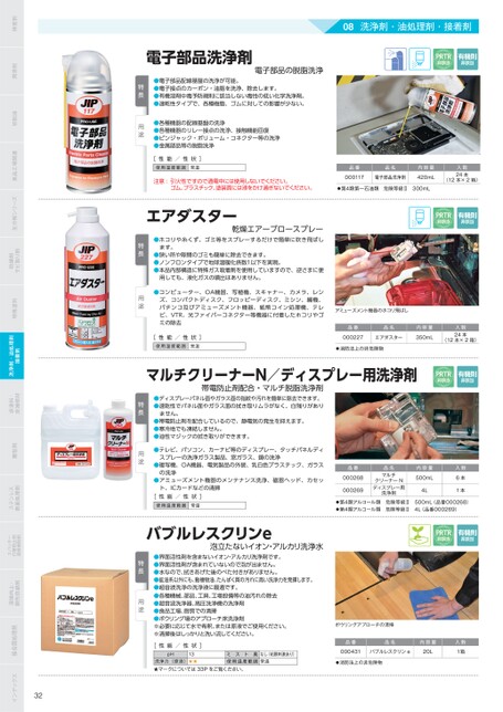 08洗浄剤・油処理剤・接着剤PRTR非該当有機則非該当品番品名000117電子部品洗浄剤内容量420mL入数24本(12本×2箱)第4類第一石油類危険等級Ⅱ300mLPRTR非該当有機則非該当電子部品洗浄剤電子部品の脱脂洗浄●電子部品配線基盤の洗浄が可能。●電子接点のカーボン・油脂を洗浄、除去します。●有機溶剤中毒予防規則に該当しない毒性の低い化学洗浄剤。●速乾性タイプで、各種樹脂、ゴムに対しての影響が少ない。●各種機器の配線基盤の洗浄●各種機器のリレー接点の洗浄、接触機能回復●ピンジャック・ボリューム・コネクター等の洗浄●金属部品等の脱脂洗浄[性能/性状]使用温度範囲常温注意:引火性ですので通電中には使用しないでください。ゴム、プラスチック、塗装面には液をかけ過ぎないでください。特長用途エアダスターます。乾燥エアーブロースプレー●ホコリや糸くず、ゴミ等をスプレーするだけで簡単に吹き飛ばし●狭い所や間のゴミも簡単に除去できます。●ノンフロンタイプで地球温暖化係数1以下を実現。●本品内部構造に特殊ガス吸着剤を使用していますので、逆さまに使用しても、液化ガスの噴出はありません。●コンピューター、OA機器、写植機、スキャナー、カメラ、レンズ、コンパクトディスク、フロッピーディスク、ミシン、編機、パチンコ及びアミューズメント機器、紙幣コイン処理機、テレビ、VTR、光ファイバーコネクター等機器に付着したホコリやゴミの除去[性能/性状]使用温度範囲常温アミューズメント機器のホコリ飛ばし品番品名000227エアダスター内容量350mL入数24本(12本×2箱)消防法上の非危険物マルチクリーナーN/ディスプレー用洗浄剤PRTR非該当有機則非該当特長用途特長用途品番000268000269品名マルチクリーナーNディスプレー用洗浄剤内容量500mL4L入数6本1本第4類アルコール類危険等級Ⅱ500mL(品番000268)第4類アルコール類危険等級Ⅱ4L(品番000269)PRTR非該当有機則非該当ボウリングアプローチの清掃帯電防止剤配合・マルチ脱脂洗浄剤●ディスプレーパネル面やガラス面の指紋や汚れを簡単に除去できます。●速乾性でパネル面やガラス面の拭き取りムラがなく、白残りがありません。●帯電防止剤を配合しているので、静電気の発生を抑えます。●寒冷地でも凍結しません。●油性マジックの拭き取りができます。●テレビ、パソコン、カーナビ等のディスプレー、タッチパネルディスプレーの洗浄ガラス製品、窓ガラス、鏡の洗浄●複写機、OA機器、電気製品の外装、乳白色プラスチック、ガラス●アミューズメント機器のメンテナンス洗浄、磁器ヘッド、カセッの洗浄ト、ICカードなどの清掃性能/性状][バブルレスクリンe泡立たないイオン・アルカリ洗浄水●界面活性剤を含まないイオン・アルカリ洗浄剤です。●界面活性剤が含まれていないので泡が出ません。●水なので、拭きあげた後のべた付きがありません。●鉱油系以外にも、動植物油、たんぱく質の汚れに高い洗浄力を発揮します。●超音波洗浄の洗浄液に最適です。●各種機械、部品、工具、工場設備等の油汚れの除去●超音波洗浄器、高圧洗浄機の洗浄剤●食品工場、厨房での清掃●ボウリング場のアプローチ床洗浄剤※必要に応じて水で希釈、または原液でご使用ください。※清掃後はしっかりと洗い流してください。特長用途使用温度範囲常温[性能/性状]pH13洗浄力(原液)★★★マークについては33Pをご覧ください。トスミ臭使用温度範囲なし(粘膜刺激あり)常温品番品名000431バブルレスクリンe内容量20L入数1箱消防法上の非危険物検査剤潤滑剤切削油食品工場関連生分解シリーズサビ取り剤防剤特殊塗料接着剤洗浄剤・油処理剤床補修材床塗料・離型剤表面処理剤ステンレス溶接補助剤付着防止剤スパッター開先防剤溶接向上・接合面処理剤インデックス32