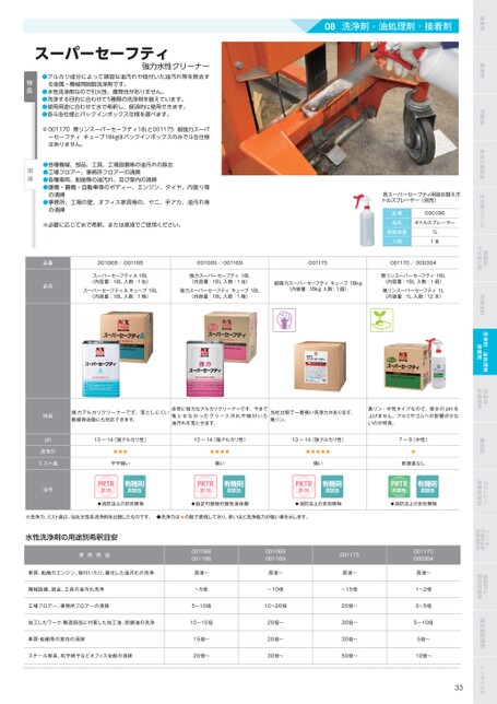 検査剤潤滑剤切削油食品工場関連生分解シリーズ防剤サビ取り剤特殊塗料洗浄剤・油処理剤接着剤床塗料・床補修材離型剤ステンレス表面処理剤スパッター付着防止剤溶接補助剤溶接向上・開先防剤接合面処理剤インデックス08洗浄剤・油処理剤・接着剤各スーパーセーフティ用詰め替えボトルスプレーヤー(別売)品番品名容器容量入数000196ボトルスプレーヤー1L1本スーパーセーフティ強力水性クリーナー●アルカリ成分によって頑固な油汚れや焼付いた油汚れ等を除去する金属・機械用脱脂洗浄剤です。●水性洗浄剤なので引火性、爆発性がありません。●洗浄する目的に合わせて5種類の洗浄剤をえています。●使用用途に合わせて水で希釈し、経済的に使用できます。●各斗缶仕様とバックインボックス仕様を選べます。※001170無リンスーパーセーフティ18Lと001175超強力スーパーセーフティキューブ18kgはバックインボックスのみで斗缶仕様はありません。●各種機械、部品、工具、工場設備等の油汚れの除去●工場フロアー、事務所フロアーの清掃●各種車両、船舶等の油汚れ、及び室内の清掃●建機・農機・自動車等のボディー、エンジン、タイヤ、内張り等●事務所、工場の壁、オフィス家具等の、ヤニ、手アカ、油汚れ等の清掃の清掃※必要に応じて水で希釈、または原液でご使用ください。特長用途品番品名001068/001168001069/001169001175001170/000304スーパーセーフティA18L(内容量:18L入数:1缶)強力スーパーセーフティ18L(内容量:18L入数:1缶)スーパーセーフティAキューブ18L(内容量:18L入数:1箱)強力スーパーセーフティキューブ18L(内容量:18L入数:1箱)超強力スーパーセーフティキューブ18kg(内容量:18kg入数:1箱)無リンスーパーセーフティ18L(内容量:18L入数:1箱)無リンスーパーセーフティ1L(内容量:1L入数:12本)特長ph洗浄力ミスト臭法令強力アルカリクリーナーです。落としにくい動植物油脂にも対応できます。非常に強力なアルカリクリーナーです。今まで落とせなかったグリース汚れや焼付いた油汚れを落とせます。当社比較で一番強い洗浄力があります。無リン。無リン・中性タイプなので、排水のpHを上げません。アルミやゴムへの影響が少ないのが特長。13〜14(強アルカリ性)13〜14(強アルカリ性)13〜14(強アルカリ性)★★★やや強いPRTR該当有機則非該当消防法上の非危険物★★★★強いPRTR該当有機則非該当指定可燃物可燃性液体類★★★★★強いPRTR該当有機則非該当消防法上の非危険物7〜8(中性)★刺激臭なしPRTR非該当有機則非該当消防法上の非危険物※洗浄力、ミスト臭は、当社水性系洗浄剤を比較したものです。◆洗浄力は★の数で表現しており、多いほど洗浄能力が強い事を示します。水性洗浄剤の用途別希釈目安使用用途車両、船舶のエンジン、焼付いたり、酸化した油汚れの洗浄機械設備、部品、工具の油汚れ洗浄工場フロアー、事務所フロアーの清掃001068001168原液〜〜5倍5〜10倍加工したワーク・製造部品に付着した加工油、防油の洗浄10〜15倍車両・船舶等の室内の清掃スチール家具、机や椅子などオフィス全般の清掃15倍〜20倍〜001069001169原液〜〜10倍10〜20倍20倍〜20倍〜30倍〜001175原液〜〜15倍20倍〜30倍〜30倍〜50倍〜001170000304原液〜1〜2倍3〜5倍5〜10倍5倍〜10倍〜33