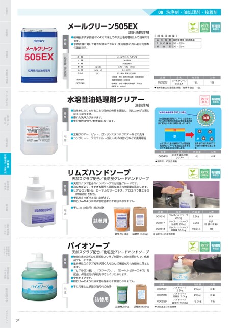 油水油油油油を水になじませることで油の分解を促進します。内容量4L入数4本PRTR非該当有機則非該当内容量2.5kg2.0kg16.0kg入数6本6袋(2袋×3箱)1箱PRTR非該当有機則非該当内容量2.5kg2.0kg16.0kg入数6本6袋1箱メールクリーン505EX流出油処理剤●船用品形式承認品(P-643)で海上での流出油処理剤として使用でき●水産資源に対して毒性が極めて少なく、生分解度の良い乳化分散型ます。の製品です。名称分類外観密度粘度引火点適用法令(SDS記載)[ℊ/㎤][mPa・s][℃]メールクリーン505EX油性液体淡黄色液体0.80〜0.82(20℃)2.4(20℃)90(第4類第三石油類)・消防法:第4類第三石油類危険等級Ⅲ・毒劇物取締法:非該当・安衛法:表示・通知対象物質非該当・PRTR法:非該当水溶性油処理剤クリアー油処理剤●油を水になじませることで油分の分解を促進し、流した水が白濁しにくくなります。●優れた洗浄力があります。●生分解性は91%(参考値)になります。08洗浄剤・油処理剤・接着剤PRTR非該当有機則非該当][準の標油A,B,C軽油添種加量類重油質薬剤使用量(対流出油)20〜25%20〜25%品番022322品名メールクリーン505EX内容量18L入数1缶第4類第三石油類水溶性危険等級Ⅲ18LPRTR該当有機則非該当「水溶性油処理剤クリアー」成分「水溶性油処理剤クリアー」に配合されている生分解性の界面活性剤は油の表面に配向しやすい性質を持っています。油滴水に浮いた油(油紋)に「水溶性油処理剤クリアー」を添加し混合することで油は水中に分散します。品番品名000410水溶性油処理剤クリアー消防法上の非危険物油水●工場フロアー、ピット、ガソリンスタンドフロアーなどの洗浄●コンクリート、アスファルト(新しいものは除く)などで使用可能リムズハンドソープ天然スクラブ配合/化粧品グレードハンドソープ●天然スクラブ配合のハンドソープで化粧品グレードです。●泡立ちがよく、すすぎも素早く頑固な油汚れを簡単に落とします。●ヒアルロン酸Na、ローヤルゼリーエキス、アロエベラ葉エキス(保湿成分)を配合。●手肌をさっぱりと洗い上げます。●粉石けんのように排水管を詰まらす原因になりません。●手についた油汚れ等の洗浄詰替用品番000516000517000518品名2.5kgリムズハンドソープリムズハンドソープ詰替用2.0kgリムズハンドソープ詰替用16.0kg詰替用2.0kg詰替用16.0kg消防法上の非危険物バイオソープ天然スクラブ配合/化粧品グレードハンドソープ●植物由来100%の生分解性スクラブを配合した液状石けんで、化粧品グレードです。ます。●生分解性スクラブ粒子が深く入り込んだ頑固な汚れを簡単に落とし●「ヒアルロン酸」、「コラーゲン」、「ローヤルゼリーエキス」を配合、保湿成分が手肌をやさしくいたわります。●中性タイプです。●粉石けんのように排水管を詰まらす原因になりません。●手に付着した頑固な油汚れの洗浄詰替用品番000527000528000529品名バイオソープ2.5kgバイオソープ詰替用2.0kgバイオソープ詰替用16.0kg34詰替用2.0kg詰替用16.0kg消防法上の非危険物特長一般性状(代表値)特長用途特長用途特長用途検査剤潤滑剤切削油食品工場関連生分解シリーズサビ取り剤防剤特殊塗料接着剤洗浄剤・油処理剤床補修材床塗料・離型剤表面処理剤ステンレス溶接補助剤付着防止剤スパッター開先防剤溶接向上・接合面処理剤インデックス