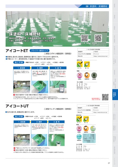 検査剤潤滑剤切削油食品工場関連生分解シリーズ防剤サビ取り剤特殊塗料洗浄剤・油処理剤接着剤床塗料・床補修材離型剤ステンレス表面処理剤スパッター付着防止剤溶接補助剤溶接向上・開先防剤接合面処理剤インデックス09床塗料・床補修材施工工事動画現地調査・ヒアリングお申し込みフォーム(一社)日本塗料工業会登録登録番号I16003ホルムアルデヒド放散等級F☆☆☆☆https://www.toryo.or.jp/問合せ先塗布方法ローラー刷毛性能防塵性耐磨耗性耐油性15kg4:10.2kg/m270〜80m2::::容合セット内容内量比配標準塗布量塗布面積床塗料・床補修材機械加工工場、倉庫、自動車整備工場、研究・実験室、印刷工場、食品工場など様々な工場床に対応可能アイコートETプライマー兼用タイプ二液型エポキシ樹脂塗料(溶剤型)●密着性、耐水性、耐油性、耐摩耗性に優れた二液タイプのエポキシ塗料です。●手軽にローラー、刷毛等を用いて塗装ができ耐久性に優れ経済的です。施工手順準備するもの●手袋●マスク●空缶●計量器●攪拌機●テープ●刷毛●ローラー1.前処理2.攪拌3.塗布水分、油分、ゴミ等をウエス、洗剤を使用して除去してください。A液(主剤)B液(硬化剤)を4:1の割合で重量比約1〜2分間攪拌機で混合してください。塗布しにくい箇所を先に刷毛にて塗布してください。次に、ローラーを用いて薄く均等に塗布してください。※ローラーは中毛を使用してください。他社の塗床材への塗り重ねの場合はご相談ください。!※下地が油まみれの床、カラーコンクリート*アクリル塗料には塗布できません。*ラッカーシンナーを染み込ませたウエス等で下地をこすり、色が付着すればアクリル系塗料です。商品詳細を動画にてご覧いただけます▶37https://www.toryo.or.jp/問合せ先塗布方法ローラー刷毛性能防塵性耐磨耗性耐候性トルエンガソリンメタノール10%酢酸:○:◎:○:◎10%硫酸10%塩酸30%リン酸10%クエン酸:◎:◎:◎:◎10%次亜塩素酸ソーダ5%苛性ソーダ:◎:◎耐薬品性10kg1:10.15kg/m260〜70m2::::容合セット内容内量配比標準塗布量塗布面積施工手順準備するもの●手袋●テープ●刷毛●ローラー●マスク●空缶●計量器●攪拌機1.前処理2.攪拌3.塗.布布水分、油分、ゴミ等をウエス、洗剤等を使用して除去してください。A液(主剤)B液(硬化剤)を重量比1:1の割合で約1〜2分間攪拌機で混合してください。塗布しにくい箇所を先に刷毛にて塗布してください。次に、ローラーを用いて薄く均等に塗布してください。※ローラーは短毛を使用してください。※下地がエポキシ系及びウレタン系塗料の場合塗布可能。アクリル系塗料には塗布できません。下塗りとしてEプライマーまたはETを塗布してください。他社の塗床材への塗り重ねの場合はご相談ください。!!アイコートUT●光沢と耐久性、耐薬品性に優れています。二液型ウレタン樹脂塗料(溶剤型)(一社)日本塗料工業会登録登録番号I16008ホルムアルデヒド放散等級F☆☆☆☆