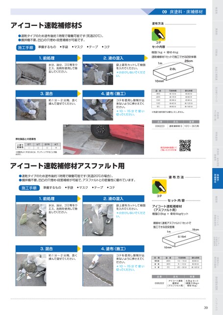 検査剤潤滑剤切削油食品工場関連生分解シリーズ防剤サビ取り剤特殊塗料洗浄剤・油処理剤接着剤床塗料・床補修材離型剤ステンレス表面処理剤スパッター付着防止剤溶接補助剤溶接向上・開先防剤接合面処理剤インデックス3909床塗料・床補修材塗布方法コテセット内容樹脂1kg+骨材4kg速乾補修材1セットで施工できる目安体積温度35℃20℃15℃10℃5℃可使時間約10分約15分約28分約40分約60分硬化時間約40分約60分約90分約120分約180分※気温5度未満では硬化いたしません。品番品名温度006223速乾補修剤S15℃〜35℃用商品詳細を動画にてご覧いただけます▶アイコート速乾補修材S●速乾タイプのため塗布後約1時間で稼働可能です(気温20℃)。●攪拌機不要。凹凸の穴埋め・段差補修が可能です。施工手順準備するもの●手袋●マスク●テープ●コテ1.前処理2.液の混入水分、油分、ゴミ等をウエス、洗剤を使用して除去してください。袋上部をカットして樹脂を入れてください。*小分けしないでください。3.混合4.塗布(施工)約1分〜2分間、良く揉んで混ぜてください。コテを使用し間が出来ないように押さえてください。*10〜15分で使い切ってください。弊社製品との密着性上塗り密着性ET○UT◎EFR◎AT×※密着をよくするためには、サンディングすることを勧めます。アイコート速乾補修材アスファルト用●速乾タイプのため塗布後約1時間で稼働可能です(気温20℃の場合)。●攪拌機不要。凹凸の穴埋め・段差補修が可能で、アスファルトとの密着性に優れています。施工手順準備するもの●手袋●マスク●テープ●コテ1.前処理2.液の混入水分、油分、ゴミ等をウエス、洗剤を使用して除去してください。袋上部をカットして樹脂を入れてください。*小分けしないでください。3.混合4.塗布(施工)約1分〜2分間、良く揉んで混ぜてください。コテを使用し間が出来ないように押さえてください。*10〜15分で使い切ってください。時期春秋期夏期冬期温度20℃30℃5℃可使時間10〜15分5〜10分25〜30分硬化時間約60分約30分約120分品番品名容量006222(アスファルト用)アイコート速乾補修材4.8kgセット(樹脂0.8kg+骨材4kg)