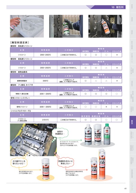 検査剤潤滑剤切削油食品工場関連生分解シリーズ防剤サビ取り剤特殊塗料洗浄剤・油処理剤接着剤床塗料・床補修材離型剤ステンレス表面処理剤スパッター付着防止剤溶接補助剤溶接向上・開先防剤接合面処理剤インデックス4110離型剤[離型剤選定表]離型剤高粘度シリコーン主剤シリコーン耐熱温度二次加工離型性熱可塑性熱硬化性ゴムシリコーン、フッ素200〜250℃二次加工はできません。◎◎○×離型剤低粘度シリコーン主剤シリコーン離型剤植物油脂系主剤植物性燐脂体離型剤フッ素系タイプR耐熱温度二次加工離型性熱可塑性熱硬化性ゴムシリコーン、フッ素200〜250℃二次加工はできません。◎◎△×耐熱温度300℃二次加工二次加工として塗装、メッキ等ができます。離型性熱可塑性熱硬化性ゴムシリコーン、フッ素◎△△×主剤耐熱温度二次加工特殊フッ素化合物200〜250℃二次加工として塗装、メッキ等ができます。離型性熱可塑性熱硬化性ゴムシリコーン、フッ素◎◎◎○変性シリコーンスプレー主剤耐熱温度二次加工変性シリコーン200〜250℃二次加工として塗装、メッキ等ができます。離型性熱可塑性熱硬化性ゴムシリコーン、フッ素○○××シャトルプロテクターFS主剤シリコーンフッ素化合物耐熱温度250℃二次加工熱可塑性熱硬化性ゴムシリコーン、フッ素離型性二次加工はできません。◎◎○○金型の防剤は…オイルタイプ、ワックスタイプ、液状気化性とあります。20Pと21Pを参照願います。ガス膜やヤニを取りたいけど…防剤をきれいに除去したい…強力洗浄剤があります。31Pを参照願います。専用洗浄剤や各種洗浄剤をえております。31Pを参照願います。