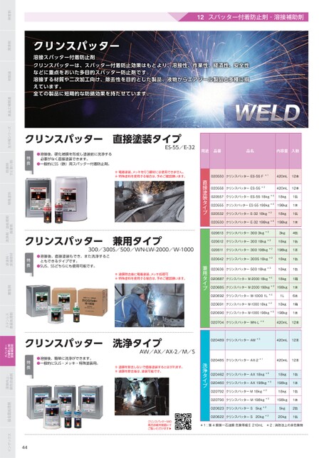 12スパッター付着防止剤・溶接補助剤クリンスパッター溶接スパッター付着防止剤クリンスパッターは、スパッター付着防止効果はもとより、溶接性、作業性、経済性、安全性などに重点をおいた多目的スパッター防止剤です。溶接する材質や二次加工向け、除去性を目的とした製品、液物からエアゾール製品と多種にえています。全ての製品に短期的な防効果を持たせています。※電着塗装、メッキを行う鋼材には使用できません。※特殊塗料を使用する場合は、予めご確認願います。020550クリンスパッターES-55F*1420mL12本用途品番品名内容量入数クリンスパッター直接塗装タイプES-55/E-32●溶接後、硬化被膜を形成し塗装前に洗浄する必要がなく直接塗装できます。●一般的にSS(鉄)用スパッター付着防止剤。特長直接塗装タイプクリンスパッター兼用タイプ300/300S/500/WN-LW-2000/W-1000●溶接後、直接塗装もでき、また洗浄することもできるタイプです。●SUS、SSどちらにも使用可能です。特長020558クリンスパッターES-55*2420mL12本020557クリンスパッターES-5518kg*218kg020555クリンスパッターES-55198kg*2198kg020532クリンスパッターE-3218kg*218kg020530クリンスパッターE-32198kg*2198kg020613クリンスパッター3003kg*23kg020612クリンスパッター30018kg*218kg020611クリンスパッター300198kg*2198kg020642クリンスパッター300S18kg*218kg1缶1本1缶1本4缶1缶1本1缶1缶1箱1本6本1箱1本020636クリンスパッター50018kg*318kg020687クリンスパッターW-200018kg*218kg020685クリンスパッターW-2000198kg*2198kg020692クリンスパッターW-10001L*21L020691クリンスパッターW-100018kg*218kg020690クリンスパッターW-1000198kg*2198kg兼用タイプ※塗膜除去後に電着塗装、メッキ処理可※特殊塗料を使用する場合は、予めご確認願います。020704クリンスパッターWN-L*4420mL12本020489クリンスパッターAW*5420mL12本020485クリンスパッターAX-2*1420mL12本020462クリンスパッターAX18kg*218kg020460クリンスパッターAX198kg*2198kg020792クリンスパッターM18kg*218kg020790クリンスパッターM198kg*2198kg020623クリンスパッターS5kg*2020622クリンスパッターS20kg*25kg20kg1缶1本1缶1本2缶1缶洗浄タイプクリンスパッター洗浄タイプAW/AX/AX-2/M/S※塗膜を除去しないで直接塗装するとはがれます。※塗膜を除去後は、塗装可能です。●溶接後、簡単に洗浄ができます。●一般的にSUS・メッキ・特殊塗装用。特長クリンスパッターMの商品詳細を動画にてご覧いただけます▶*1:第4類第一石油類危険等級Ⅱ210mL*2:消防法上の非危険物44検査剤潤滑剤切削油食品工場関連生分解シリーズサビ取り剤防剤特殊塗料接着剤洗浄剤・油処理剤床補修材床塗料・離型剤表面処理剤ステンレス溶接補助剤付着防止剤スパッター開先防剤溶接向上・接合面処理剤インデックス