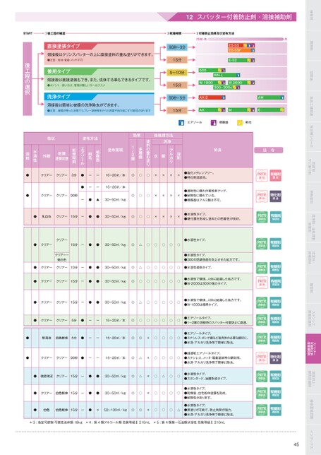 12スパッター付着防止剤・溶接補助剤インデックス接合面処理剤溶接向上・開先防剤付着防止剤スパッター溶接補助剤ステンレス表面処理剤離型剤床塗料・床補修材洗浄剤・油処理剤接着剤特殊塗料防剤サビ取り剤生分解シリーズ食品工場関連切削油潤滑剤検査剤性状塗布方法塗布面積効果後処理方法特長1〜2層多層盛塗料の重ね塗り洗浄溶剤水溶性外観乾燥塗膜状態乾燥時間エアゾール刷毛噴霧器水酸アルカリ溶剤●クリアークリアー3分●ーー15〜20㎡/本◎○○××××●塩化メチレンフリー。●特化則非該当。●クリアークリアー90秒●ーー15〜20㎡/本◎○○××××●耐熱性に優れている。●速乾性に優れ作業効率アップ。●噴霧器はアルミ製は不可。ー●▲30〜50㎡/kg●乳白色クリアー15分ー●●30〜50㎡/kg◎○○××××●水溶性タイプ。●硬化膜を形成し塗料との密着性が良好。●クリアークリアー15分ー●●30〜50㎡/kg◎△○○○○○●水溶性タイプ。クリアー〜微白色●水溶性タイプ。●300の防性能を向上させた処方です。●クリアークリアー10分ー●●30〜50㎡/kg◎△○○○○○●水溶性速乾タイプ。●クリアークリアー15分ー●●30〜50㎡/kg◎○○○○○○●水溶性で環境、人体に配慮した処方です。●W-2000は300の強力タイプ。●クリアークリアー15分ー●●30〜50㎡/kg◎△○○○○○●水溶性で環境、人体に配慮した処方です。●W-1000は標準タイプ。●クリアークリアー5分●ーー15〜20㎡/本◎○○○○○○●エアゾールタイプ。●1〜2層の溶接時のスパッター付着防止に最適。●懸濁液白色粉体5分●ーー15〜20㎡/本◎◎×○○○○●ステンレス・ボンデ鋼など後洗浄の必要な鋼材に。●エアゾールタイプ。●水洗・アルカリ洗浄等で簡単に除去。●クリアークリアー90秒●ーー15〜20㎡/本◎△×○○○○●ステンレス、メッキ・電着塗装等の鋼材用。●超速乾エアゾールタイプ。●水洗・アルカリ洗浄等で簡単に除去。●微懸濁液クリアー15分ー●●30〜50㎡/kg◎△×○△○○●水溶性タイプ。●スタンダード、油膜形成タイプ。●クリアー白色粉体15分ー●●30〜50㎡/kg◎○×○○○○●乾燥後、白色粉体塗膜を形成。●水溶性タイプ。●耐熱性があります。●白色白色粉体15分ー●×50〜100㎡/kg◎◎×○○○△●厚塗りが可能で、防止効果が強力。●水溶性タイプ。●水洗・アルカリ洗浄等で簡単に除去。法令PRTR該当有機則該当PRTR該当特化則該当PRTR該当特化則該当PRTR非該当有機則非該当PRTR非該当有機則非該当PRTR非該当有機則非該当PRTR非該当有機則非該当PRTR非該当有機則非該当PRTR非該当有機則非該当PRTR非該当有機則非該当PRTR非該当有機則非該当PRTR非該当有機則非該当PRTR該当有機則非該当択選の程工後直接塗装タイプ可不キッメ・着電・体粉:意注●熔接後はクリンスパッターの上に直接塗料の重ね塗りができます。メススおへ方いし難が理管、け分い使:トンイポ●熔接後は直接塗装もでき、また、洗浄する事もできるタイプです。兼用タイプすまりあが性能可すこ起を良不着密とう行を等装塗ーレプスで態状たっ残が膜被:意注●溶接後は簡単に被膜の洗浄除去ができます。洗浄タイプ90秒〜3分15分5〜10分15分90秒〜5分15分①後工程の確認②乾燥時間③付着防止効果及び塗布方法(性能)低高STARTW-1000WN-LAX-2AWES-55FES-55E-32500W-2000300・300sAXMS:エアゾール:噴霧器:刷毛*3:指定可燃物可燃性液体類18kg*4:第4類アルコール類危険等級Ⅱ210mL*5:第4類第一石油類水溶性危険等級Ⅱ210mL45
