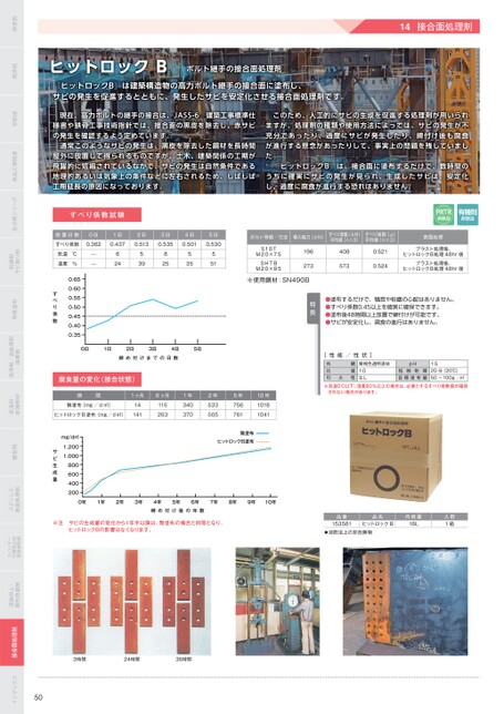 ●塗布するだけで、騒音や粉塵の心配はありません。●すべり係数0.45以上を確実に確保できます。●塗布後48時間以上放置で締付けが可能です。●サビが安定化し、腐食の進行はありません。特長14接合面処理剤ヒットロックBボルト継手の接合面処理剤『ヒットロックB』は建築構造物の高力ボルト継手の接合面に塗布し、サビの発生を促進するとともに、発生したサビを安定化させる接合面処理剤です。現在、高力ボルトの継手の接合は、JASS-6建築工事標準仕様書や鉄骨工事技術指針では、接合面の黒皮を除去し、赤サビの発生を確認するよう定めています。通常このようなサビの発生は、黒皮を除去した鋼材を長時間屋外に放置して得られるものですが、土木、建築関係の工期が飛躍的に短縮されているなかで、サビの発生は自然条件である地理的あるいは気象上の条件などに左右されるため、しばしば工期延長の原因になっております。このため、人工的にサビの生成を促進する処理剤が用いられますが、処理剤の種類や使用方法によっては、サビの発生が不充分であったり、過度にサビが発生したり、締付け後も腐食が進行する懸念があったりして、事実上の問題を残していました。『ヒットロックB』は、接合面に塗布するだけで、数時間のうちに確実にサビの発生が見られ、生成したサビは、安定化し、過度に腐食が進行する恐れはありません。すべり係数試験PRTR非該当有機則非該当放置日数0日1日すべり係数0.3620.437気温℃湿度%̶̶6242日0.5135393日4日5日0.5350.5010.530825535551ボルト等級・寸法導入軸力(kN)すべり荷重(kN)平均値(n=3)すべり係数(μ)平均値(n=3)表面処理S10TM20×75SHTBM20×951962734085730.5210.524ブラスト処理後、ヒットロックB処理48hr後ブラスト処理後、ヒットロックB処理48hr後※使用鋼材:SN490B腐食量の変化(接合状態)期間1ヶ月6ヶ月無塗布(mg/d㎡)ヒットロックB塗布(mg/d㎡)141411152631年3403702年5335055年75676110年10181041[性能/性状]外比引火観重性黄褐色透明液体1.0なしpH乾触指燥目標塗布量1.520分(20℃)50〜100g/㎡※気温5℃以下、湿度80%以上の場合は、必要とするすべり係数値が確保されない場合があります。※注サビの生成量の変化から1年半以降は、無塗布の場合と同等となり、ヒットロックBの影響はなくなります。品番153581品名ヒットロックB内容量18L入数1箱消防法上の非危険物3時間24時間36時間50検査剤潤滑剤切削油食品工場関連生分解シリーズサビ取り剤防剤特殊塗料接着剤洗浄剤・油処理剤床補修材床塗料・離型剤表面処理剤ステンレス溶接補助剤付着防止剤スパッター開先防剤溶接向上・接合面処理剤インデックス