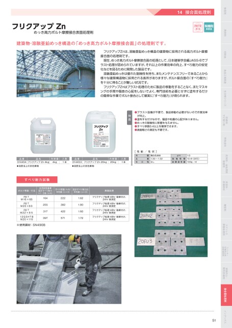 検査剤潤滑剤切削油食品工場関連生分解シリーズ防剤サビ取り剤特殊塗料洗浄剤・油処理剤接着剤床塗料・床補修材離型剤ステンレス表面処理剤スパッター付着防止剤溶接補助剤溶接向上・開先防剤接合面処理剤インデックス●ブラスト設備が不要で、製品移動の必要がないので作業効率●塗布するだけなので、騒音や粉塵の心配がありません。●めっきの耐性に影響を与えません。●すべり係数0.4以上を確保できます。●表面粗さの測定も不要です。が向上。特長フリクアップZnめっき高力ボルト摩擦接合表面処理剤建築物・溶融亜鉛めっき構造の「めっき高力ボルト摩擦接合面」の処理剤です。14接合面処理剤PRTR該当有機則非該当フリクアップZnは、溶融亜鉛めっき構造の建築物に採用される高力ボルト摩擦接合面の処理剤です。現在、めっき高力ボルト摩擦接合面の処理として、日本建築学会編JASS-6でブラスト処理が認められていますが、それ以上の作業効率の向上、すべり耐力の安定化などを図るために開発した製品です。溶融亜鉛めっきは優れた耐性を持ち、またメンテナンスフリーであることから様々な建築構造物に採用される長所がありますが、ボルト接合面の『すべり耐力』を十分に得ることが難しい状況です。フリクアップZnはブラスト処理のために製品の移動をすることなく、またマスキングの手間や騒音の心配をしないでよく、専門技術を必要とせずに塗布するだけの簡単な作業でボルト接合として確実に『すべり耐力』が得られます。品番品名フリクアップZn4kg014454消防法上の非危険物内容量4kg入数1本品番品名014453消防法上の非危険物フリクアップZn20kg内容量20kg入数1本[性能/性状]外比引火観重性微白色液体1.30〜1.32なしpH乾触指燥目標塗布量すべり耐力試験ボルト等級・寸法合否判定基準設計すべり耐力×1.2倍(kN)すべり荷重(kN)平均値(n=3)設計すべり耐力比平均値(n=3)表面処理F8TM16×65F8TM20×80F8TM22×8512GSHTBM20×110164255317397※使用鋼材:SN490B2223824225711.621.801.601.72フリクアップ処理48hr後締付け、24hr後測定フリクアップ処理48hr後締付け、24hr後測定フリクアップ処理48hr後締付け、24hr後測定フリクアップ処理48hr後締付け、24hr後測定1.010分(20℃)100g/㎡51