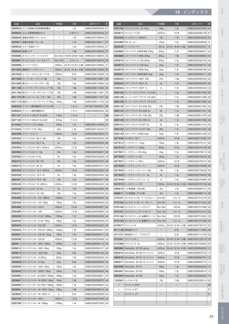 インデックス接合面処理剤溶接向上・開先防剤付着防止剤スパッター溶接補助剤ステンレス表面処理剤離型剤床塗料・床補修材洗浄剤・油処理剤接着剤特殊塗料防剤サビ取り剤生分解シリーズ食品工場関連切削油潤滑剤検査剤15インデックス品番品名内容量入数JANコード頁000933エコノⅡ詰替式充填機用設置台―1台498532900933927000934エコノⅡ専用充填缶セット―3本セット498532900934627000940詰替式充填スプレーセット―一式498532910940427000941詰替式充填スプレー缶―1本498532910941127000942エアー充填ホース―1本498532910942827000943定量コック―1個498532910943527000985オイルハンターシートタイプ50cm×50cm100枚(20枚×5袋)498532910985535000987オイルハンターロールタイプ50cm×33m2ロール498532910987935000999スーパーペネトン400mL24本(12本×2箱)49853291099928001020植物性パーツクリーナー500mL24本(6本×4箱)498532901020530001022ヒートシールチェッカーバイオ320mL6本498532901022919001068スーパーセーフティA18L18L1缶498532901068733001069強力スーパーセーフティ18L18L1缶498532901069433001168スーパーセーフティAキューブ18L18L1箱498532901168433001169強力スーパーセーフティキューブ18L18L1箱498532901169133001170無リンスーパーセーフティ18L18L1箱498532901170733001175超強力スーパーセーフティキューブ18kg18kg1箱498532901175233006222アイコート速乾補修材アスファルト用―1セット497467206222139006223アイコート速乾補修材S―1セット498532906223539007101アイコートWAUT-CLEAR14kg1セット―38007102アイコートWAUT-CLEAR3.5kg1セット―38014453フリクアップZn20kg20kg1本498532914453551014454フリクアップZn4kg4kg1本498532914454251020326ライナークリンF420mL12本498532920326347020352クリンウエルドSE-F18L18L1缶498532920352248020353クリンウエルドSE-F4L4L1缶498532920353948020355クリンウエルドSE-F420mL420mL12本498532920355348020362クリンウエルドH18L18L1缶498532920362149020363クリンウエルドH4L4L1缶498532920363849020372クリンウエルドSE18L18L1缶498532920372049020373クリンウエルドSE4L4L1缶498532920373749020425クリンウエルドYE-F420mL420mL12本498532920425348020426クリンウエルドYE-F4L4L1缶498532920426048020427クリンウエルドYE-F18L18L1缶498532920427748020435クリンウエルドYE420mL420mL12本498532920435249020436クリンウエルドYE4L4L1缶498532920436949020437クリンウエルドYE18L18L1缶498532920437649020460クリンスパッターAX198kg198kg1本498532920460444020462クリンスパッターAX18kg18kg1缶498532920462844020485クリンスパッターAX-2420mL12本498532920485744020489クリンスパッターAW420mL12本498532920489544020530クリンスパッターE-32198kg198kg1本498532920530444020532クリンスパッターE-3218kg18kg1缶498532920532844020550クリンスパッターES-55F420mL12本498532920550244020555クリンスパッターES-55198kg198kg1本498532920555744020557クリンスパッターES-5518kg18kg1缶498532920557144020558クリンスパッターES-55420mL12本498532920558844020611クリンスパッター300198kg198kg1本498532920611044020612クリンスパッター30018kg18kg1缶498532920612744020613クリンスパッター3003kg3kg4缶498532920613444020622クリンスパッターS20kg20kg1缶498532920622644020623クリンスパッターS5kg5kg2缶498532920623344020636クリンスパッター50018kg18kg1缶498532920636344020642クリンスパッター300S18kg18kg1缶498532920642444020685クリンスパッターW-2000198kg198kg1本498532920685144020687クリンスパッターW-200018kg18kg1箱498532920687544020690クリンスパッターW-1000198kg198kg1本498532920690544020691クリンスパッターW-100018kg18kg1箱498532920691244020692クリンスパッターW-10001L1L6本498532920692944020704クリンスパッターWN-L420mL12本498532920704944020790クリンスパッターM198kg198kg1本498532920790244品番品名内容量入数JANコード頁020792クリンスパッターM18㎏18kg1缶498532920792644020813クリンビードCB420mL12本498532920813847022322メールクリーン505EX18L1缶498532922322334023362NKホーマー15kg1缶49853292336286025240リークフォーマー351g24本(6本×4箱)49853292524076025862ステンライト中和洗浄液20kg20kg1本498532925862143025866ステンライトH-80020kg20kg1箱498532925866943025872ステンライトC-10020kg20kg1本498532925872043025873ステンライトC-1004kg4kg1本498532925873743025876ステンライトH-8005kg5kg1本498532925876843026021ステンライト中和洗浄液4kg4kg1本498532926021143026052ステンブライトNB-F20L20L1箱498532926052543026053ステンブライトNB-F4L4L1本498532926053243026054ステンブライトNB-F1L1L1本498532926054943026105スーパーステンブライトTK-230―1台498532926105842026108スーパーステンブライトTK-330―1台498532926108942026109スーパーステンブライトTK-510―1台498532926109642026132ステンブライトEH-40020L20L1箱498532926132443026133ステンブライトEH-4004L4L1本498532926133143026137ステンブライトEH-70020L20L1箱498532926137943026138ステンブライトEH-7004L4L1本498532926138643026151ステンブライトE-HOT5L5L1本498532926151543026152ステンブライトE-HOT20L20L1本498532926152243026153ステンライトH-9005kg5kg1本498532926153943027539タイボロンSD-1420mL12本498532927539047027912トーチクリーン15kg15kg1缶498532927912146027913トーチクリーン300g300g10缶498532927913846027921トーチクリーンKS4kg4kg1本498532927921346027922トーチクリーンKS18kg1缶498532927922046027937トーチクリーンRS-L420mL12本498532927937446027939トーチクリーンスーパー220mL12本498532927939846027942トーチクリーンスーパー18L18L1缶498532927942846027943トーチク