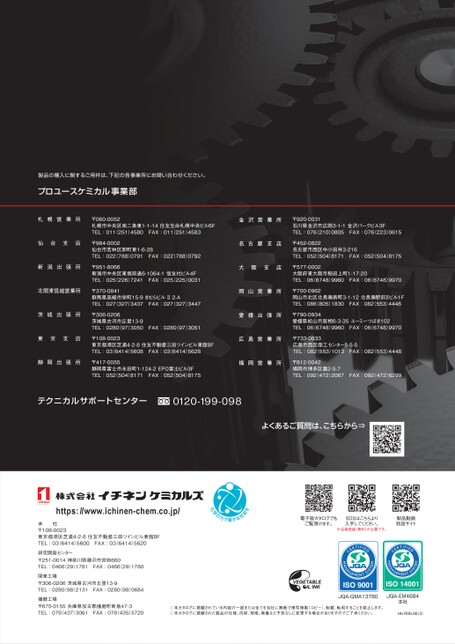 製品の購入に関するご用件は、下記の各事業所にお問い合わせください。プロユースケミカル事業部札幌営業所仙台支店新潟出張所北関東信越営業所茨城出張所東京支店静岡出張所〒060-0052札幌市中央区南二条東1-1-14住友生命札幌中央ビル6FTEL:011(251)4580FAX:011(251)4583〒984-0002仙台市若林区卸町東1-6-28TEL:022(788)0791FAX:022(788)0792〒951-8066新潟市中央区東堀前通6-1064-1信友社ビル4FTEL:025(226)7241FAX:025(225)0031〒370-0841群馬県高崎市栄町15-9きむらビルⅡ2-ATEL:027(327)3437FAX:027(327)3447〒306-0206茨城県古河市丘里13-9TEL:0280(97)3050FAX:0280(97)3051〒108-0023東京都港区芝浦4-2-8住友不動産三田ツインビル東館8FTEL:03(6414)5608FAX:03(6414)5628〒417-0055静岡県富士市永田町1-124-2EPO富士ビル3FTEL:052(504)8171FAX:052(504)8175金沢営業所名古屋支店大阪支店岡山営業所愛媛出張所広島営業所福岡営業所〒920-0031石川県金沢市広岡3-1-1金沢パークビル3FTEL:076(210)0805FAX:076(223)0615〒452-0822名古屋市西区中小田井3-216TEL:052(504)8171FAX:052(504)8175〒577-0002大阪府東大阪市稲田上町1-17-20TEL:066748)9960FAX:06(6748)9970〒700-0962岡山市北区北長瀬表町3-1-12北長瀬駅前Ⅱビル1FTEL:086(805)1830FAX:082(553)4448〒790-0934愛媛県松山市居相6-3-35ユーミーつばき102TEL:066748)9960FAX:06(6748)9970〒733-0833広島市西区商工センター5-5-5TEL:082(553)1013FAX:082(553)4448〒812-0042福岡市博多区豊2-5-7TEL:092(472)2067FAX:092(472)6299テクニカルサポートセンター0120-199-098よくあるご質問は、こちらから⇒https://www.ichinen-chem.co.jp/本社〒108-0023東京都港区芝浦4-2-8住友不動産三田ツインビル東館8FTEL:03(6414)5600FAX:03(6414)5620電子版カタログでもご覧頂けます。※会員登録(無料)が必要です。SDSはこちらより入手してください。製品動画特設サイト研究開発センター〒251-0014神奈川県藤沢市宮前660TEL:0466(29)1781FAX:0466(29)1780関東工場〒306-0206茨城県古河市丘里13-9TEL:0280(98)2131FAX:0280(98)0684播磨工場〒675-0155兵庫県加古郡播磨町新島47-3TEL:079(437)3061FAX:079435)572056○本カタログに掲載されている内容の一部または全てを当社に無断で複写複製(コピー)、転載、転用することを禁止します。○本カタログに掲載された製品の仕様、内容、規格、廃番など予告なしに変更する場合がありますのでご了承ください。JQA-QMA13780JQA-EM4684本社HK.R06.063)
