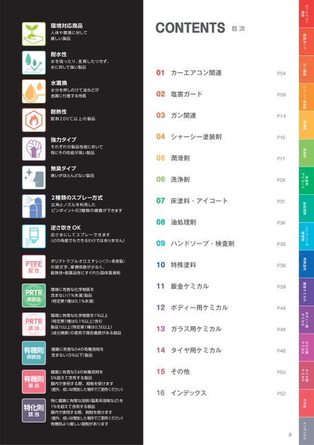 カーエアコン関連塩害ガードガン関連シャーシー塗装剤潤滑剤洗浄剤床塗料アイコート油処理剤ハンドソープ検査剤特殊塗料鈑金ケミカルボディー用ケミカルガラス用ケミカルタイヤ用ケミカルその他インデックスP04P08P14P16P17P24P31P34P36P38P39P44P46P48P50P523CONTENTS目次01カーエアコン関連02塩害ガード03ガン関連04シャーシー塗装剤05潤滑剤06洗浄剤07床塗料・アイコート08油処理剤09ハンドソープ・検査剤10特殊塗料11鈑金ケミカル12ボディー用ケミカル13ガラス用ケミカル14タイヤ用ケミカル15その他16インデックス環境対応商品人体や環境に対して優しい製品耐水性水を吸ったり、変質したりせず、水に対して強い製品水置換水分を押しのけて油などが金属に付着する性質耐熱性耐熱200℃以上の製品強力タイプそれぞれの製品性能において特にその性能が高い製品無臭タイプ臭いがほとんどない製品2種類のスプレー方式広角とノズルを利用したピンポイントの2種類の噴霧ができます逆さ吹きOK逆さまにしてスプレーできます(どの角度でもできるわけではありません)PTFE配合ポリテトラフルオロエチレン(フッ素樹脂)の頭文字、摩擦係数が少なく、耐熱性•耐薬品性にすぐれた固体潤滑剤PRTR非該当環境に有害な化学物質を含まない(1%未満)製品(特定第1種は0.1%未満)PRTR該当有機則非該当有機則該当特化則該当環境に有害な化学物質を1%以上(特定第1種は0.1%以上)含む製品1t以上(特定第1種は0.5t以上)(成分換算)の使用で報告義務がある製品健康に有害な54の有機溶剤を含まない(5%以下)製品健康に有害な54の有機溶剤を5%超えて含有する製品屋内で使用する際、規制を受けます(屋外、或いは開放した場所でご使用ください)特に健康に有害な溶剤(塩素系溶剤など)を1%を超えて含有する製品屋内で使用する際、規制を受けます(屋外、或いは開放した場所でご使用ください)有機則より厳しい規制があります