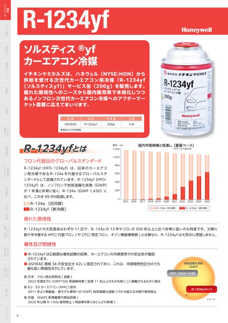 ソルスティスyfカーエアコン冷媒イチネンケミカルズは、ハネウェル(NYSE:HON)から供給を受ける次世代カーエアコン用冷媒「R-1234yf(ソルスティスyf)」サービス缶(200g)を販売します。優れた環境性へのニーズから国内販売車で本格化しつつあるノンフロン次世代カーエアコン冷媒へのアフターマーケット需要に応えてまいります。品番品名000505R-1234yf内容量200g入数4本消防法上の非危険物R-1234yfとはフロン代替品のグローバルスタンダードR-1234yf(HFO-1234yf)は、旧来のカーエアコン用冷媒であるR-134aを代替するグローバルスタンダードとして認識されています。R-1234yf(HFO-1234yf)は、ノンフロンで地球温暖化係数(GWP)が1未満と非常に低く、R-134a(GWP1,430)に比べ、これを99.9%削減します。R-134a(旧冷媒)R-1234yf(新冷媒)優れた環境性単位:mt1,200国内市場規模と見通し(重量ベース)※サービス缶のみ1,000800600400200020152016201720182019202020212022202320242025R-134a(旧冷媒)R-1234yf(新冷媒)R-1234yfの大気寿命はわずか11日で、R-134aの13年やCO2の500年以上に比べ非常に低いのも特長です。分解に数十年を要するHFC(代替フロン)やCFC(特定フロン、オゾン層破壊物質)とは異なり、R-1234yfは大気中に滞留しません。毒性及び燃焼性●R-1234yfは広範囲な毒性試験の結果、カーエアコンの冷媒使用での安全性が確認されています。●ASHRAE規格34の安全区分A2Lに指定されており、これは、冷媒微燃性区分のうち最も低い燃焼性を示しています。■日本フロン排出抑制法(省略)2023年度までにGWP150(新規乗用車(定員11名以上のものを除く)に掲載されるものに限る■EUEUカーエアコン(MAC)指令2011年より発動後、新モデル車両へのGWP(地球温暖化指数)150を超える冷媒の使用禁止■米国SNAP(新規重要代替品政策)2020年以降R-134a使用禁止(特装車を除くほとんどの新車)地球温暖化係数(GWP)HFC-134a=1430R-1234yf=<1イメージ関連カーエアコン塩害ガードガン関連シャーシー塗装剤潤滑剤洗浄剤アイコート床塗料油処理剤検査剤ハンドソープ特殊塗料鈑金ケミカルケミカルボディー用ケミカルガラス用ケミカルタイヤ用その他インデックス4