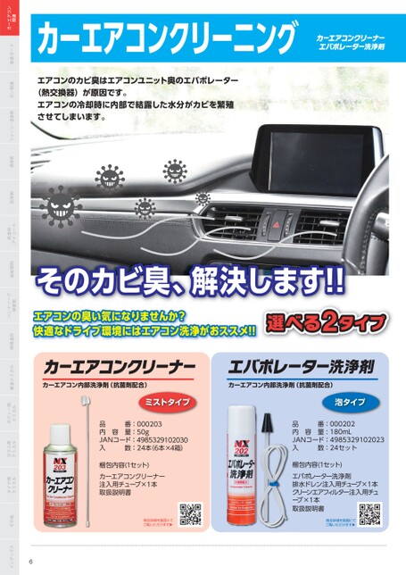 カーエアコンクリーニングエアコンのカビ臭はエアコンユニット奥のエバポレーター(熱交換器)が原因です。エアコンの冷却時に内部で結露した水分がカビを繁殖させてしまいます。そのカビ臭、解決します!!2タイプエアコンの臭い気になりませんか?快適なドライブ環境にはエアコン洗浄がおススメ!!選べるカーエアコン内部洗浄剤(抗菌剤配合)カーエアコン内部洗浄剤(抗菌剤配合)泡タイプJANコード:4985329102023入42:数セット梱包内容(1セット)エバポレーター洗浄剤排水ドレン注入用チューブ×1本クリーンエアフィルター注入用チューブ×1本取扱説明書商品詳細を動画にてご覧いただけます▶202000:番容量:180mL品内ミストタイプ品番:000203内容量:50gJANコード:4985329102030入数:24本(6本×4箱)梱包内容(1セット)カーエアコンクリーナー注入用チューブ×1本取扱説明書商品詳細を動画にてご覧いただけます▶関連カーエアコン塩害ガードガン関連シャーシー塗装剤潤滑剤洗浄剤アイコート床塗料油処理剤検査剤ハンドソープ特殊塗料鈑金ケミカルケミカルボディー用ケミカルガラス用ケミカルタイヤ用その他インデックス6