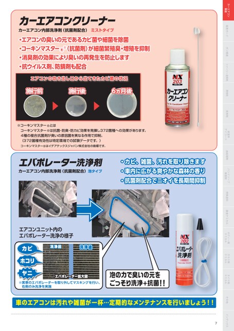 カーエアコン関連塩害ガードガン関連シャーシー塗装剤潤滑剤洗浄剤床塗料アイコート油処理剤ハンドソープ検査剤特殊塗料鈑金ケミカルボディー用ケミカルガラス用ケミカルタイヤ用ケミカルその他インデックスカーエアコン内部洗浄剤(抗菌剤配合)ミストタイプ・エアコンの臭いの元であるカビ菌や細菌を除菌・コーキンマスタ・消臭剤の効果により臭いの再発生を防止します(抗菌剤)が細菌繁殖臭・増殖を抑制ー®※エアコンの吹き出し口から出てきたカビ菌の状況施行前施行後6ヵ月後※コーキンマスターとはコーキンマスターは抗菌・防臭・防カビ効果を発揮し372菌種への効果があります。4種の複合抗菌剤が臭いの原因菌を異なる作用で抑制。(372菌種有効性は特定環境での試験データです。)コーキンマスターはイデアテックスジャパン株式会社の商標です。カーエアコン内部洗浄剤(抗菌剤配合)泡タイプ・カビ、雑菌、汚れを取り除きます・車内に広がる爽やかな森林の香り・抗菌剤配合でニオイを長期間抑制エアコンユニット内のエバポレーター洗浄の様子カビホコリヤニ洗浄前洗浄後エバポレーター拡大図※実車のエバポレーターを取り外してマスキングを行い、右側のみ洗浄を実施泡の力で臭いの元をごっそり洗浄+抗菌!!車のエアコンは汚れや雑菌が一杯…定期的なメンテナンスを行いましょう!!7