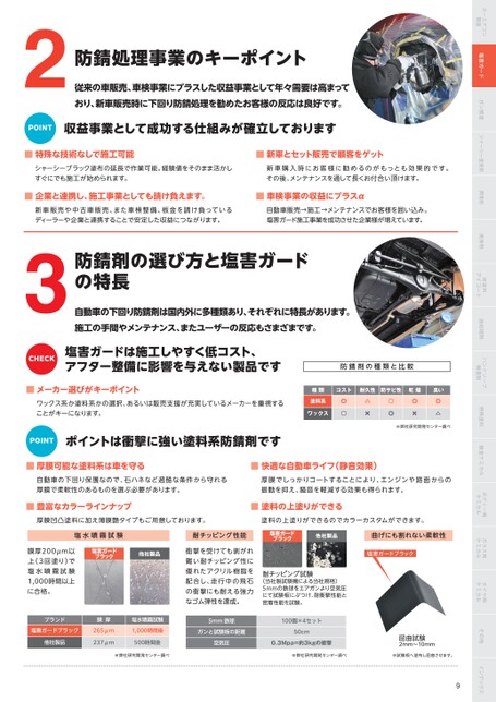 カーエアコン関連塩害ガードガン関連シャーシー塗装剤潤滑剤洗浄剤床塗料アイコート油処理剤ハンドソープ検査剤特殊塗料鈑金ケミカルボディー用ケミカルガラス用ケミカルタイヤ用ケミカルその他インデックス9塩害ガードは施工しやすく低コスト、アフター整備に影響を与えない製品ですメーカー選びがキーポイントワックス系か塗料系かの選択、あるいは販売支援が充実しているメーカーを重視することがキーになります。POINTポイントは衝撃に強い塗料系防剤です防剤の種類と比較種類塗料系ワックスコスト耐久性防サビ性乾燥臭い◎○△×○◎◎×◎△※弊社研究開発センター調べ■厚膜可能な塗料系は車を守る■快適な自動車ライフ(静音効果)自動車の下回り保護なので、石ハネなど過酷な条件から守れる厚膜で柔軟性のあるものを選ぶ必要があります。厚膜でしっかりコートすることにより、エンジンや路面からの振動を抑え、騒音を軽減する効果も得られます。■豊富なカラーラインナップ■塗料の上塗りができる厚膜凹凸塗料に加え薄膜艶タイプもご用意しております。塗料の上塗りができるのでカラーカスタムができます。塩水噴霧試験耐チッピング性能塩害ガードブラック他社製品曲げにも割れない柔軟性塩害ガードブラック他社製品膜厚200μm以上(3回塗り)で塩水噴霧試験1,000時間以上に合格。衝撃を受けても剥がれ難い耐チッピング性に優れたアクリル樹脂を配合し、走行中の飛石の衝撃にも耐える強力なゴム弾性を達成。耐チッピング試験(当社製試験機による当社規格)5mmの鉄球をエアガンより空気圧にて試験板にぶつけ、耐衝撃性能と密着性能を試験。ブランド塩害ガードブラック他社製品膜厚265μm237μm塩水噴霧試験1,000時間後500時間後5mm鉄球ガンと試験板の距離空気圧100個×4セット50cm0.3Mpa=約3kgの衝撃屈曲試験2mm〜10mm※弊社研究開発センター調べ※弊社研究開発センター調べ※試験板へ塗布し屈曲させます。2■POINT3■CHECK防処理事業のキーポイント従来の車販売、車検事業にプラスした収益事業として年々需要は高まっており、新車販売時に下回り防処理を勧めたお客様の反応は良好です。収益事業として成功する仕組みが確立しております特殊な技術なしで施工可能シャーシーブラック塗布の延長で作業可能。経験値をそのまま活かしすぐにでも施工が始められます。■新車とセット販売で顧客をゲット新車購入時にお客様に勧めるのがもっとも効果的です。その後、メンテナンスを通して長くお付合い頂けます。■企業と連携し、施工事業としても請け負えます。■車検事業の収益にプラスα新車販売や中古車販売、また車検整備、板金を請け負っているディーラーや企業と連携することで安定した収益につながります。自動車販売→施工→メンテナンスでお客様を囲い込み。塩害ガード施工事業を成功させた企業様が増えています。防剤の選び方と塩害ガードの特長自動車の下回り防剤は国内外に多種類あり、それぞれに特長があります。施工の手間やメンテナンス、またユーザーの反応もさまざまです。