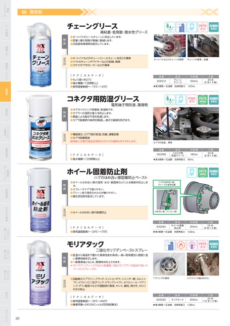 PRTR該当有機則非該当高粘着・低飛散・耐水性グリースチェーングリース●オートバイのシールチェーンに対応しています。●密着に優れ飛散が極端に軽減します。●白色固体潤滑剤を配合しています。特長●オートバイなどのチェーン(シールチェーン対応)の潤滑●リフトのチェーンやワイヤーなどの防、潤滑●スライドドアのローラーなどの潤滑オートバイなどのチェーンの潤滑チェーンの潤滑、防品番000512品名チェーングリース内容量300mL入数24本(6本×4箱)第4類第一石油類危険等級Ⅱ120mLPTFE配合PRTR非該当有機則非該当コネクタ用防湿グリース電気端子用防湿、潤滑剤●カプラハウジング用潤滑、防湿剤です。●カプラへの湿気の進入を防止します。●腐食による接点不良を低減します。●カプラ脱着時の負荷を軽減し、端子の破損を防ぎます。特長ーデルカニクテタ][●ちょう度=約275●塩水噴霧=72時間以上●使用温度範囲=-15℃〜120℃品番000285品名コネクタ用防湿グリース内容量180mL入数24本(6本×4箱)第4類第一石油類危険等級Ⅱ90mLPRTR非該当有機則非該当ハブのはめ合い部、グリースの塗布位置ホイール固着防止剤ハブのはめ合い部固着防止ペースト●ホイールはめ合い部の湿気・水分・融雪剤などによる腐食を防止しま●スプレータイプで塗りやすい。●グリーン色で塗布されたのが解りやすい。●極圧添加剤を配合しています。す。特長ニクテ[●塩水噴霧=120時間以上カルデータ]●電装部分、カプラ部の防湿、防、通電改善●カプラ脱着軽減使用前には電子部品洗浄剤(P29)での清掃をおすすめします。カプラの防湿、潤滑●ホイールはめ合い部の固着防止はめ合い部(インロー部)品番000284品名ホイール固着防止剤内容量300mL入数24本(6本×4箱)第4類第一石油類危険等級Ⅱ120mLPRTR該当有機則非該当二硫化モリブデンペーストスプレー●低温から高温まで優れた潤滑性能を保持し、高い耐荷重性と極度に低●一般潤滑油となじみ、潤滑性を向上させます。※モリブデングリースではなく高濃度二硫化モリブデンを鉱油で溶いたい摩擦係数を示します。特長ペーストスプレーです。ニクテ[●使用温度範囲=-20℃〜170℃タ]カルデーモリアタック●自動車のスプライン、クラッチ、ミッションギヤ、シリンダー壁、カムシャフト、ピストンピン及びリング、クランクシャフト、オイルシール、ベアリング、デフ、軸受けなどの動部の潤滑、キシミ、磨耗、焼付き、かじり付きの防止ベアリングの潤滑スプラインの組み付けにデルカニクテ[●使用温度範囲=-30℃〜400℃●融着荷重=2452N(シェル式四球試験法)タ]ー品番品名000022モリアタック内容量300mL入数24本(12本×2箱)第4類第一石油類危険等級Ⅱ108mL関連カーエアコン塩害ガードガン関連シャーシー塗装剤潤滑剤洗浄剤アイコート床塗料油処理剤検査剤ハンドソープ特殊塗料鈑金ケミカルケミカルボディー用ケミカルガラス用ケミカルタイヤ用その他インデックス20