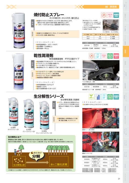 カーエアコン関連塩害ガードガン関連シャーシー塗装剤潤滑剤洗浄剤床塗料アイコート油処理剤ハンドソープ検査剤特殊塗料鈑金ケミカルボディー用ケミカルガラス用ケミカルタイヤ用ケミカルその他インデックスPRTR該当有機則非該当[焼付き防止スプレーの効果]①焼付き防止スプレーを塗布したネジと塗布していないネジを標準トルクでセットする。②650℃で24時間連続加熱する。③加熱終了後測定(下表)ネジの直径(mm)塗布トルク値(N/m)未塗布トルク値(N/m)ネジの焼付き、かじり付き防止M12M24品番00019938272ネジ破損ネジ破損品名焼付防止スプレー内容量300mL入数24本(6本×4箱)第4類第一石油類危険等級Ⅱ120mLPTFE配合PRTR非該当有機則該当ベルトの鳴き止め、潤滑品番品名000186乾性潤滑剤内容量65mL入数48本(12本×4箱)第4類アルコール類危険等級Ⅱ26mLPRTR非該当有機則非該当[テクニカルデータ]●生分解率=60%以上(OECD301C/28日間)ネジの焼付き、かじり付き、酸化防止●高温のかかるネジの焼付き、かじり付き、酸化を防止します。(締め付け前に塗布する事で固着、融着を防止します)●-30℃〜1400℃までの広い温度範囲で使用できます。特長焼付防止スプレー乾性被膜潤滑剤PTFE分散タイプ●乾性被膜(PTFE粉)なので、ベトつかずホコリなどが付着しにくい。●プラスチック、ゴムの潤滑に最適です。●Vベルト等のベルトの鳴き止めに。●耐溶剤性(ガソリン、薬品など)に強く、効果が長期間持続します。特長乾性潤滑剤生分解性潤滑、防剤●スプレー原液は生分解率60%以上(OECD301C/28日間)の生分解性なので環境にやさしい潤滑剤です。特長生分解性シリーズ●Vベルトのプーリーへ塗布、ベルトの鳴き止め●ドアロック、ヒンジ、チェーン等の潤滑●オイルシール、ゴムホース装着時の潤滑●樹脂部品の動部の潤滑]ターデルカニクテ[●使用温度範囲=250℃以下●耐熱性=250℃●振子式摩擦係数=0.04〜0.07●高温のかかる機械のネジ、ボルト、ナットなどの焼付き●かじり付き、固着、融着の防止]ターデルカニクテ[●使用温度範囲=-30℃〜1400℃●塩水噴霧=120時間以上●屋内防=1年以上●農業機械、林業機械などの潤滑、防、整備、メンテナンス生分解性オイルスプレーEX生分解性グリーススプレーEX生分解性チェーンオイルスプレーEX生分解性とは?環境保全(森林、農場、河川)に気を付けなければならない場所での使用に適しています。溶液の中の有機化学物質が、微生物によって水(H2O)と二酸化炭素(CO2)等に分解され自然界に戻る性質のことを言います。農機チェーン部の潤滑に農機メンテナンスに品番000820000821000822品名生分解性オイルスプレーEX生分解性グリーススプレーEX生分解性チェーンオイルスプレーEX内容量420mL420mL420mL入数24本24本24本(6本×4箱)(6本×4箱)(6本×4箱)※多量のオイルは環境への負荷が大きすぎますので、むやみに廃棄せず、関連法令に従って処理してください。第4類第三石油類危険等級Ⅲ168mL(品番000820)第4類第三石油類危険等級Ⅲ210mL(品番000821)第4類第四石油類危険等級Ⅲ168mL(品番000822)21