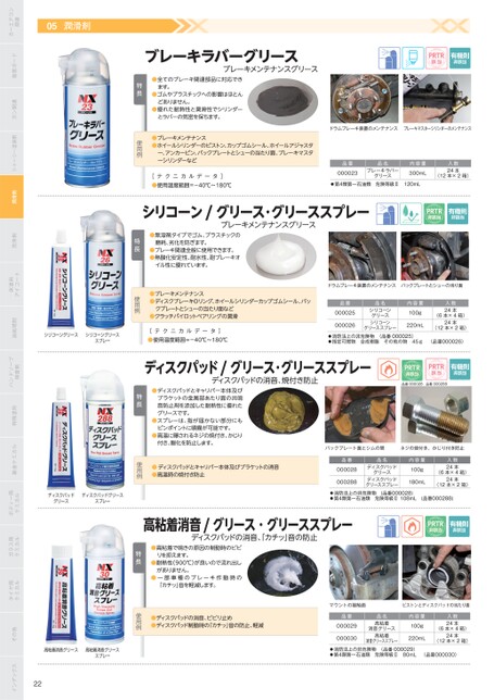 PRTR該当有機則非該当ドラムブレーキ装置のメンテナンスブレーキマスターシリンダーのメンテナンス品番000023品名ブレーキラバーグリース内容量300mL入数24本(12本×2箱)第4類第一石油類危険等級Ⅱ120mLブレーキラバーグリースブレーキメンテナンスグリース●全てのブレーキ関連部品に対応でき●ゴムやプラスチックへの影響はほとんどありません。●優れた耐熱性と潤滑性でシリンダーとラバーの気密を保ちます。ます。特長●ブレーキメンテナンス●ホイールシリンダーのピストン、カップゴムシール、ホイールアジャスター、アンカーピン、バックプレートとシューの当たり面、ブレーキマスターシリンダーなどニクテ[●使用温度範囲=-40℃〜180℃タ]カルデーシリコーン/グリース・グリーススプレーブレーキメンテナンスグリースPRTR非該当有機則非該当●ブレーキメンテナンス●ディスクブレーキOリング、ホイールシリンダーカップゴムシール、バックプレートとシューの当たり面など●クラッチパイロットベアリングの潤滑ニクテ[●使用温度範囲=-40℃〜180℃カルデータ]ドラムブレーキ装置のメンテナンスバックプレートとシューの当り面品番000025000026品名シリコーングリースシリコーングリーススプレー内容量100g220mL入数24本24本(6本×4箱)(12本×2箱)消防法上の非危険物(品番000025)指定可燃物合成樹脂その他の物45g(品番000026)ディスクパッド/グリース・グリーススプレーディスクパッドの消音、焼付き防止PRTR非該当PRTR該当有機則非該当品番000028品番000288●無溶剤タイプでゴム、プラスチックの磨耗、劣化を防ぎます。●ブレーキ関連全般に使用できます。●熱酸化安定性、耐水性、耐ブレーキオイル性に優れています。特長シリコーングリースシリコーングリーススプレー●ディスクパッドの消音、ビビリ止め●ディスクパッド制動時の「カチッ」音の防止、軽減品番000029000030品名高粘着消音グリース高粘着消音グリーススプレー内容量100g220mL入数24本24本(6本×4箱)(12本×2箱)マウントの接触面ピストンとディスクパッドの当たり面消防法上の非危険物(品番000029)第4類第一石油類危険等級Ⅱ80mL(品番000030)●高粘着で鳴きの原因の制動時のビビ●耐熱性(900℃)が良いので流れ出しリを抑えます。がありません。●一部車種のブレーキ作動時の「カチッ」音を軽減します。特長高粘着消音グリース高粘着消音グリーススプレー22●ディスクパッドとキャリパー本体及びブラケットの消音●高温時の焼付き防止品番000028000288品名ディスクパッドグリースディスクパッドグリーススプレー内容量100g180mL入数24本24本(6本×4箱)(12本×2箱)ディスクパッドグリースディスクパッドグリーススプレー消防法上の非危険物(品番000028)第4類第一石油類危険等級Ⅱ108mL(品番000288)バックプレート面とシムの間ネジの焼付き、かじり付き防止高粘着消音/グリース・グリーススプレーディスクパッドの消音、カチッ」音の防止PRTR非該当有機則非該当●ディスクパッドとキャリパー本体及びブラケットの金属部あたり面の共鳴音防止剤を添加した耐熱性に優れたグリースです。●スプレーは、指が届かない部分にもピンポイントに噴霧が可能です。●高温に曝されるネジの焼付き、かじり付き、酸化を防止します。特長関連カーエアコン塩害ガードガン関連シャーシー塗装剤潤滑剤洗浄剤アイコート床塗料油処理剤検査剤ハンドソープ特殊塗料鈑金ケミカルケミカルボディー用ケミカルガラス用ケミカルタイヤ用その他インデックス
