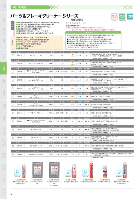 パーツ&ブレーキクリーナーシリーズ有機則非該当PRTR該当PRTR非該当有機則非該当①②③④⑤⑥⑦⑧⑨⑩⑪⑫⑬ータ]ルクニカテ[デ使用温度範囲=常温※注意…可燃性ですので通電中には使用しないでください。ゴム、プラスチック、塗装面には液を多量にかけ過ぎないでください。★マークについて※洗浄力、乾燥性、樹脂への影響は、当社溶剤系洗浄剤を比較したものです。★の数量で能力の表現をしています。多いほど性能が良い。◆洗浄力は★の数で表現しており、多いほど洗浄能力が強い事を示します。◆乾燥性は★の数で表現しており、多いほど乾燥性が速い事を示します。◆樹脂影響は★の数で表現しており、多いほど樹脂に影響がないことを示します。※ただし、樹脂の種類により影響が出るものもあります。目立たない部分にてテストしてご使用してください。●有機溶剤中毒予防規則に該当しない毒性の低い化学洗浄剤です。●金属部品、金型、精密機器等の油汚れを素早く除去します。●液剤そのものは金属に対しての腐食性はありません。●各種樹脂、ゴムに対する影響が少ない。(品番000603不燃性ブレーキクリーナーを除く)●容量、乾燥性、洗浄力の違う多様な製品をえています。特長●自動車・フォークリフト等、ブレーキ周りの洗浄●金属部品、金型、工具等の防油や切削油の洗浄●ギアボックス、ベアリングのグリース汚れ落とし●油圧機器、シリンダーの油汚れ落とし●チェーンの油汚れ落とし●精密機器の洗浄①②③④⑤⑥⑦⑧⑨⑩⑪⑫⑬品番000257品番品名M-1クリーナー18L品名000258M-1クリーナー840mL内容量18L内容量840mL入数1缶入数30本洗浄力★★★★洗浄力★★★★乾燥性樹脂影響★★★乾燥性樹脂影響★★★特長有機則非該当タイプ中、洗浄力が一番強いタイプネジ口タイプ詰替え式充填スプレーシステム使用可第4類第一石油類危険等級Ⅱ18L特長有機則非該当タイプ中、洗浄力が一番強いタイプ840mLジャンボ缶第4類第一石油類危険等級Ⅱ672mL品番000600品番000262品番000265品番000062品番000598品番品名内容量入数洗浄力乾燥性樹脂影響特長強力パーツ&ブレーキクリーナーSUPERMAX840mL24本(12本×2箱)★★★★★★洗浄力が強いタイプ840mLジャンボ缶品名パーツ&ブレーキクリーナーA18L品名パーツ&ブレーキクリーナーT18L品名パーツ&ブレーキクリーナーA品名パーツ&ブレーキクリーナー840内容量18L内容量18L入数1缶入数1缶洗浄力★★★洗浄力★★★乾燥性樹脂影響★★★★乾燥性樹脂影響★★★★第4類第一石油類危険等級Ⅱ588mL特長000062パーツ&ブレーキクリーナーAの18L液物タイプエコノ詰替充填機システム使用可第4類第一石油類危険等級Ⅱ18L特長000062パーツ&ブレーキクリーナーAの18Lネジ口タイプ詰替式充填スプレーシステム使用可第4類第一石油類危険等級Ⅱ18L内容量入数洗浄力乾燥性樹脂影響特長500mL24本(12本×2箱)★★★★★★★標準仕様、オールマイティータイプ内容量840mL入数30本洗浄力乾燥性樹脂影響特長第4類第一石油類危険等級Ⅱ350mL★★★★★★★840mLジャンボ缶でお徳用タイプ品名内容量入数洗浄力乾燥性樹脂影響特長第4類第一石油類危険等級Ⅱ588mL000118パーツ&ブレーキクリーナー420mL24本(6本×4箱)★★★★★★樹脂、ゴムに対しての影響が少ない品番000601品番000251品番000255品番000355品番品名内容量入数洗浄力速乾パーツ&ブレーキクリーナーSUPERMAX840mL24本(12本×2箱)★乾燥性★★★第4類第一石油類危険等級Ⅱ294mL樹脂影響特長★★★乾燥が一番速いタイプ840mLジャンボ缶品名2Bクリーナー18L内容量18L入数1缶洗浄力乾燥性樹脂影響★★★★★第4類第一石油類危険等級Ⅱ588mL特長第二石油類のクリーナーの18L液物タイプネジロタイプ詰替式充填スプレーシステム使用可第4類第二石油類危険等級Ⅲ18L品名内容量入数洗浄力乾燥性樹脂影響特長2BクリーナーS500mL24本(12本×2箱)★★★★★第二石油類のクリーナーのエアゾールタイプ2Wayノズル、逆さ使用可第4類第二石油類危険等級Ⅲ250mL品名内容量入数洗浄力乾燥性樹脂影響特長強力2BクリーナーS500mL24本(12本×2箱)★★★★★★第二石油類系洗浄剤の中でも強力な洗浄力があります。品名内容量入数洗浄力乾燥性樹脂影響特長第4類第二石油類危険等級Ⅲ250mL000603不燃性ブレーキクリーナー156g24本(12本×2箱)消防法上の非危険物なので引火点がなく、炭化水素系ブレーキクリーナーと比較して安全性が高い。消防法上の非危険物逆さ吹きOK逆さ吹きOK逆さ吹きOK逆さ吹きOK③品番000600④品番000262強力パーツ&ブレーキクリーナーパーツ&ブレーキクリーナーASUPERMAX18L⑤品番000265パーツ&ブレーキクリーナーT18L※ネジ口タイプ⑥品番000062パーツ&ブレーキクリーナーA⑦品番000598パーツ&ブレーキクリーナー840⑧品番000118パーツ&ブレーキクリーナー⑨品番000601速乾パーツ&ブレーキクリーナーSUPERMAX24関連カーエアコン塩害ガードガン関連シャーシー塗装剤潤滑剤洗浄剤アイコート床塗料油処理剤検査剤ハンドソープ特殊塗料鈑金ケミカルケミカルボディー用ケミカルガラス用ケミカルタイヤ用