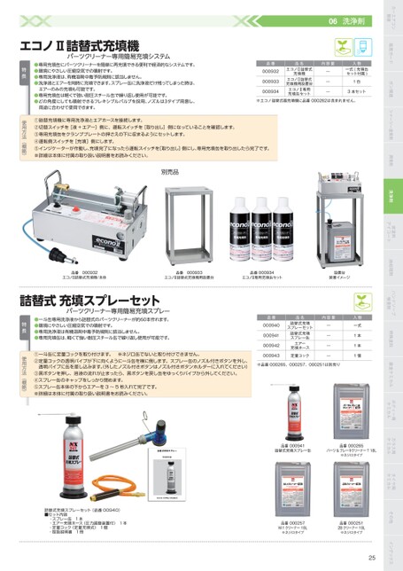 カーエアコン関連塩害ガードガン関連シャーシー塗装剤潤滑剤洗浄剤床塗料アイコート油処理剤ハンドソープ検査剤特殊塗料鈑金ケミカルボディー用ケミカルガラス用ケミカルタイヤ用ケミカルその他インデックス品番000932000933000934品名エコノⅡ詰替式充填機エコノⅡ詰替式充填機用設置台エコノⅡ専用充填缶セット内容量―――入数一式(充填缶セット付属)1台3本セット※エコノ詰替式器充填機に品番000262は含まれません。①詰替充填機に専用洗浄液とエアホースを接続します。②切替スイッチを[液+エアー]側に、運転スイッチを[取り出し]側になっていることを確認します。③専用充填缶をクランププレートの押さえの下に収まるようにセットします。④運転側スイッチを[充填]側にします。⑤インジケーターが作動し、充填完了になったら運転スイッチを[取り出し]側にし、専用充填缶を取り出したら完了です。※詳細は本体に付属の取り扱い説明書をお読みください。別売品品番000932エコノⅡ詰替式充填機/本体品番000933エコノⅡ詰替式充填機用設置台品番000934エコノⅡ専用充填缶セット設置台装着イメージ品番000940000941000942品名詰替式充填スプレーセット詰替式充填スプレー缶エアー充填ホース000943定量コック内容量――――入数一式1本1本1個※品番000265、000257、000251は別売り品番000941詰替式充填スプレー缶品番000265パーツ&ブレーキクリーナーT18L※ネジ口タイプ品番000257M-1クリーナー18L※ネジ口タイプ品番0002512Bクリーナー18L※ネジ口タイプ25①一斗缶に定量コックを取り付けます。※ネジ口缶でないと取り付けできません。②定量コックの透明パイプが下に向くように一斗缶を横に倒します。スプレー缶のノズル付きボタンを外し、透明パイプに缶を差し込みます。外したノズル付きボタンはノズル付きボタンホルダーに入れてください)③黒ボタンを押し、溶液の流れが止まったら、黒ボタンを戻し缶をゆっくりパイプから外してください。④スプレー缶のキャップをしっかり閉めます。⑤スプレー缶本体の下からエアーを3〜5秒入れて完了です。※詳細は本体に付属の取り扱い説明書をお読みください。詰替式充填スプレーセット(品番00940)■セット内容・スプレー缶1本・エアー充填ホース(圧力調整装置付)1本・定量コック(定量充填式)1個・取扱説明書1冊詰替式充填スプレーセットパーツクリーナー専用簡易充填スプレー●一斗缶専用洗浄液から詰替式のパーツクリーナーが約60本作れます。●環境にやさしい圧縮空気での噴射です。●専用洗浄液は有機溶剤中毒予防規則に該当しません。●専用充填缶は、軽くて強い耐圧スチール缶で繰り返し使用が可能です。特長用途に合わせて使用できます。エアーのみの充填も可能です。●専用充填缶は軽くて強い耐圧スチール缶で繰り返し使用が可能です。●どの角度にしても噴射できるフレキシブルバルブを採用、ノズルは3タイプ用意し、●専用充填缶にパーツクリーナーを簡単に再充填できる便利で経済的なシステムです。●環境にやさしい圧縮空気での噴射です。●専用洗浄液は、有機溶剤中毒予防規則に該当しません。●洗浄液とエアーを同時に充填できます。スプレー缶に洗浄液だけ残ってしまった時は、特長エコノⅡ詰替式充填機パーツクリーナー専用簡易充填システム