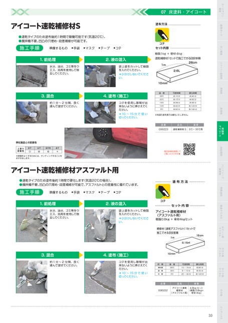 カーエアコン関連塩害ガードガン関連シャーシー塗装剤潤滑剤洗浄剤床塗料アイコート油処理剤ハンドソープ検査剤特殊塗料鈑金ケミカルボディー用ケミカルガラス用ケミカルタイヤ用ケミカルその他インデックス33塗布方法コテセット内容樹脂1kg+骨材4kg速乾補修材1セットで施工できる目安体積温度35℃20℃15℃10℃5℃可使時間約10分約15分約28分約40分約60分硬化時間約40分約60分約90分約120分約180分※気温5度未満では硬化いたしません。品番品名温度006223速乾補修剤S5℃〜35℃用商品詳細を動画にてご覧いただけます▶アイコート速乾補修材S●速乾タイプのため塗布後約1時間で稼働可能です(気温20℃)。●攪拌機不要。凹凸の穴埋め・段差補修が可能です。施工手順準備するもの●手袋●マスク●テープ●コテ1.前処理2.液の混入水分、油分、ゴミ等をウエス、洗剤を使用して除去してください。袋上部をカットして樹脂を入れてください。*小分けしないでください。3.混合4.塗布(施工)約1分〜2分間、良く揉んで混ぜてください。コテを使用し間が出来ないように押さえてください。*10〜15分で使い切ってください。弊社製品との密着性上塗り密着性ET○UT◎EFR◎AT×※密着をよくするためには、サンディングすることをおすすめします。アイコート速乾補修材アスファルト用●速乾タイプのため塗布後約1時間で硬化します(気温20℃の場合)。●攪拌機不要。凹凸の穴埋め・段差補修が可能で、アスファルトとの密着性に優れています。施工手順準備するもの●手袋●マスク●テープ●コテ1.前処理2.液の混入水分、油分、ゴミ等をウエス、洗剤を使用して除去してください。袋上部をカットして樹脂を入れてください。*小分けしないでください。3.混合4.塗布(施工)約1分〜2分間、良く揉んで混ぜてください。コテを使用し間が出来ないように押さえてください。*10〜15分で使い切ってください。時期春秋期夏期冬期温度20℃30℃5℃可使時間10〜15分5〜10分25〜30分硬化時間約60分約30分約120分品番品名容量006222(アスファルト用)アイコート速乾補修材4.8kgセット(樹脂0.8kg+骨材4kg)