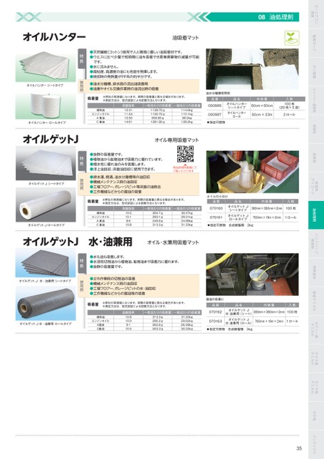 カーエアコン関連塩害ガードガン関連シャーシー塗装剤潤滑剤洗浄剤床塗料アイコート油処理剤ハンドソープ検査剤特殊塗料鈑金ケミカルボディー用ケミカルガラス用ケミカルタイヤ用ケミカルその他インデックス油水分離層使用例品番品名内容量オイルハンターシートタイプオイルハンターロール50cm×50cm入数100枚(20枚×5袋)50cm×33m2ロールオイルハンターロールタイプオイルゲットJエンジンオイル植物油A重油C重油自重倍率一枚当たりの吸着量一箱当たりの吸着量00098512.3111.5410.5014.611139.70g1100.75g959.80g1281.90g114.0kg110.1kg96.0kg128.2kg000987指定可燃物オイル専用吸着マット吸着量※弊社の実測値になります。実際の吸着量と異なる場合があります。※測定方法は、型式認証による試験方法となります。油吸着マット●天然繊維(コットン)使用で人と環境に優しい油吸着材です。●ウエスに比べ少量で短時間に油を吸着でき産業廃棄物の減量が可能です。●水に沈みません。●高粘度、高濃度の油にも性能を発揮します。●焼却時の発熱量がPP系の約半分です。●油水分離槽、排水路の流出油吸着剤●油庫やオイル交換作業時の油流出時の吸着特長オイルハンターオイルハンターシートタイプオイルの小分け品番070160070161品名オイルゲットJシートタイプオイルゲットJロールタイプ内容量入数380mm×380mm×2mm100枚760mm×19m×2mm1ロール指定可燃物合成樹脂類3kg漏油の吸着に品番070162070163品名内容量オイルゲットJ水・油兼用(シート)380mm×380mm×2mm入数100枚オイルゲットJ水・油兼用(ロール)760mm×19m×2mm1ロール指定可燃物合成樹脂類3kg35商品詳細を動画にてご覧いただけます●排水溝、側溝、油水分離槽等の油回収●機械メンテナンス時の油回収●工場フロアー、ガレージピット等床面の油除去●工作機械などからの漏油の吸着●抜群の吸着量です。●植物油から鉱物油まで吸着力に優れています。●撥水性に優れ油のみを吸着します。●浮上油回収、床面油回収に使用できます。特長吸着量※弊社の実測値になります。実際の吸着量と異なる場合があります。※測定方法は、型式認証による試験方法となります。エンジンオイル植物油A重油C重油自重倍率一枚当たりの吸着量一箱当たりの吸着量10.510.18.610.8304.7g293.1g249.8g313.3g30.47kg29.31kg24.98kg31.33kgオイルゲットJシートタイプオイルゲットJロールタイプオイルゲットJ水・油兼用オイル・水兼用吸着マットエンジンオイル植物油A重油C重油自重倍率一枚当たりの吸着量一箱当たりの吸着量10.810.09.110.5313.3g290.2g262.8g303.2g31.33kg29.02kg26.28kg30.32kg●立ち作業時の切削油の吸着●機械メンテナンス時の油回収●工場フロアー、ガレージピットの水・油回収●工作機械などからの漏油等の吸着吸着量※弊社の実測値になります。実際の吸着量と異なる場合があります。※測定方法は、型式認証による試験方法となります。●水も油も吸着します。●水溶性切削油から植物油、鉱物油まで吸着力に優れます。●抜群の吸着量です。特長オイルゲットJ水・油兼用シートタイプオイルゲットJ水・油兼用ロールタイプ
