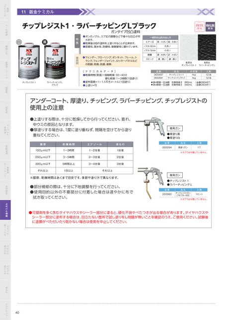 一般的な山肌の出し方エアー圧高:小さい低:大きいノズル6mmノズル5mm大きい小さい距離遠:大きい近:小さいスピード速:低い遅:高いPRTR該当特化則該当肌見本チップレジスト1肌見本ラバーチッピングL品番000487000491品名チップレジスト1ラバーチッピングLブラック内容量1kg1kg入数12缶12缶第4類第一石油類危険等級Ⅱ860mL(品番000487)第4類第一石油類危険等級Ⅱ940mL(品番000491)チップレジスト1・ラバーチッピングLブラックガンタイプ凹凸塗料●ガンのノズル、エア圧の調整などで様々な凹凸が作れます。●乾燥後は他の塗料を上塗りすることが出来ます。●密着性、耐水性、防性、耐衝撃性に優れています。●フェンダー、フローリング、ボンネット、フレーム、トランク、フェンダージョイント、ロッカーパネルなどの防、防食、防振、断熱ータ]テクデニカル[●乾燥時間(常温)=指触乾燥:30〜40分硬化乾燥:1〜2時間(1回塗り)●塗布面積=1〜1.5平方メートル(1回塗り)●上塗り=可特長チップレジスト1ラバーチッピングLブラックアンダーコート、厚塗り、チッピング、ラバーチッピング、チップレジストの使用上の注意●上塗りする際は、十分に乾燥してから行ってください。膨れ、●厚塗りする場合は、1度に塗り重ねず、間隔を空けてから塗り中ウミの原因となります。重ねてください。膜厚100μm以下200μm以下乾燥時間1〜3時間3〜5時間300μm以下5時間以上エアゾール1〜2往復2〜3往復3〜4往復液もの1往復2往復3往復それ以上1日以上それ以上※膜厚、乾燥時間はあくまで目安です。季節や塗り方で異なります。●部分補修の際は、十分に下地調整を行ってください。●使用目的以外の不要部分に付着した場合は速やかに布で拭き取ってください。専用ガン●厚塗り黒●厚塗り白品番品名000094厚塗りガン入数1丁※カプラは付属していません。専用ガン●チップレジスト1●ラバーチッピングL品番000960品名チップレジストガン(アダプター付き)入数1セット※カプラは付属していません。●可塑剤を多く含むタイヤハウスやシーラー部分に塗ると、硬化不良やべたつきが出る場合があります。タイヤハウスやシーラー部分に塗布する場合は、目立たない箇所で試し塗りをし問題が無いことを確認のうえ、ご使用ください。試験後に塗膜がべた付いたり乾かない場合は使用を中止してください。関連カーエアコン塩害ガードガン関連シャーシー塗装剤潤滑剤洗浄剤アイコート床塗料油処理剤検査剤ハンドソープ特殊塗料鈑金ケミカルケミカルボディー用ケミカルガラス用ケミカルタイヤ用その他インデックス40