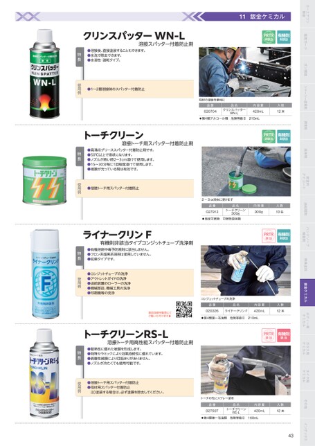 カーエアコン関連塩害ガードガン関連シャーシー塗装剤潤滑剤洗浄剤床塗料アイコート油処理剤ハンドソープ検査剤特殊塗料鈑金ケミカルボディー用ケミカルガラス用ケミカルタイヤ用ケミカルその他インデックスPRTR非該当有機則非該当内容量420mL入数12本●1〜2層溶接時のスパッター付着防止母材の溶接作業時に品番020704クリンスパッター品名WN-LクリンスパッターWN-L溶接スパッター付着防止剤●溶接後、直接塗装することもできます。●水洗で除去できます。●水溶性・速乾タイプ。特長第4類アルコール類危険等級Ⅱ210mLPRTR非該当有機則非該当溶接トーチ用スパッター付着防止剤トーチクリーン●高沸点グリーススパッター付着防止剤です。●50℃以上で液状になります。●ノズルが熱い時2〜3cm浸けて使用します。●15〜30分毎に1回程度浸けて使用します。●被膜が光っている間は有効です。特長品番品名トーチクリーン027913300g指定可燃物可燃性固体類内容量300g入数10缶PRTR該当有機則非該当有機則非該当タイプコンジットチューブ洗浄剤ライナークリンF●有機溶剤中毒予防規則に該当しません。●フロン系塩素系溶剤は使用していません。●低臭タイプです。特長●溶接トーチ用スパッター付着防止2〜3㎝液体に浸けます第4類第一石油類危険等級Ⅱ160mL43●コンジットチューブの洗浄●アウトレットガイドの洗浄●送給装置のローラーの洗浄●機械部品、機械工具の洗浄●印刷機等の洗浄商品詳細を動画にてご覧いただけます▶コンジェットチューブの洗浄品番品名020326ライナークリンF内容量420mL入数12本第4類第一石油類危険等級Ⅱ210mLPRTR該当有機則該当内容量420mL入数12本●溶接トーチ用スパッター付着防止●母材用スパッター付着防止注)塗装する場合は、必ず塗膜を除去してください。トーチの先にスプレー塗布品番027937トーチクリーン品名RS-LトーチクリーンRS-L溶接トーチ用高性能スパッター付着防止剤●耐熱性に優れた被膜を形成します。●特殊セラミックにより効果持続性に優れています。●剥離性被膜により目詰まりがありません。●ノズルが冷たくても使用可能です。特長