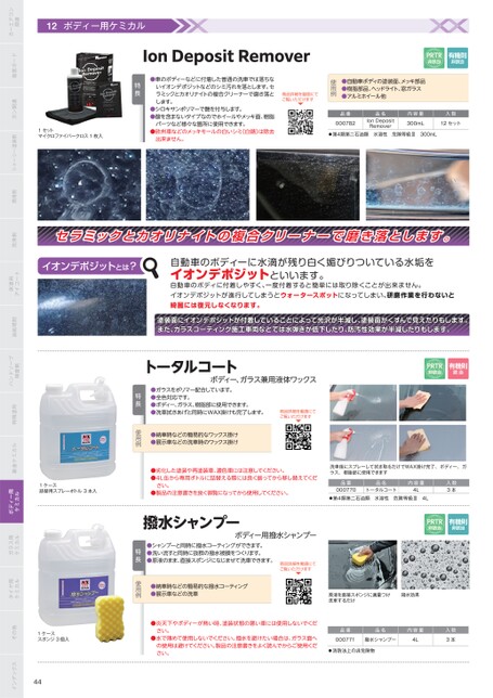 IonDepositRemoverPRTR非該当有機則非該当商品詳細を動画にてご覧いただけます●自動車ボディの塗装面、メッキ部品●樹脂部品、ヘッドライト、窓ガラス●アルミホイール他品番000782品名IonDepositRemover内容量300mL入数12セット第4類第二石油類水溶性危険等級Ⅲ300mL●車のボディーなどに付着した普通の洗車では落ちないイオンデポジットなどのシミ汚れを落とします。セラミックとカオリナイトの複合クリーナーで磨き落とします。●シロキサンポリマーで艶を付与します。●酸を含まないタイプなのでホイールやメッキ面、樹脂パーツなど様々な箇所に使用できます。●欧州車などのメッキモールの白いシミ(白)は除去出来ません。特長1セットマイクロファイバークロス1枚入セラミックとカオリナイトの複合クリーナーで磨き落とします。イオンデポジットとは?自動車のボディーに水滴が残り白く媚びりついている水垢をイオンデポジットといいます。自動車のボディに付着しやすく、一度付着すると簡単には取り除くことが出来ません。イオンデポジットが進行してしまうとウォータースポットになってしまい、研磨作業を行わないと綺麗には復元しなくなります。塗装面にイオンデポジットが付着していることによって光沢が半減し、塗装面がくすんで見えたりもします。また、ガラスコーティング施工車両などでは水弾きが低下したり、防汚性効果が半減したりもします。PRTR非該当有機則該当洗車後にスプレーして拭き取るだけでWAX掛け完了、ボディー、ガラス、樹脂部に使用できます品番000770品名トータルコート内容量4L第4類第二石油類水溶性危険等級Ⅲ4L入数3本PRTR非該当有機則非該当原液を直接スポンジに適量つけ洗車するだけ撥水効果品番品名000771撥水シャンプー内容量4L入数3本消防法上の非危険物トータルコートボディー、ガラス兼用液体ワックス●ガラスをポリマー配合しています。●全色対応です。●ボディー、ガラス、樹脂部に使用できます。●洗車拭きあげと同時にWAX掛けも完了します。商品詳細を動画にてご覧いただけます●納車時などの簡易的なワックス掛け●展示車などの洗車時のワックス掛け●劣化した塗装や再塗装車、濃色車には注意してください。●4L缶から専用ボトルに詰替える際には良く振ってから移し替えてください。●製品の注意書きを良く御覧になってから使用してください。特長1ケース詰替用スプレーボトル3本入撥水シャンプーボディー用撥水シャンプー●シャンプーと同時に撥水コーティングができます。●洗い流すと同時に抜群の撥水被膜をつくります。●原液のまま、直接スポンジになじませて洗車できます。商品詳細を動画にてご覧いただけます●納車時などの簡易的な撥水コーティング●展示車などの洗車さい。●炎天下やボディーが熱い時、塗装状態の悪い車には使用しないでくだ●水で薄めて使用しないでください。撥水を避けたい場合は、ガラス面への使用は避けてください。製品の注意書きをよく読んでからご使用ください。特長1ケーススポンジ3個入44関連カーエアコン塩害ガードガン関連シャーシー塗装剤潤滑剤洗浄剤アイコート床塗料油処理剤検査剤ハンドソープ特殊塗料鈑金ケミカルケミカルボディー用ケミカルガラス用ケミカルタイヤ用その他インデックス