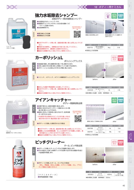 カーエアコン関連塩害ガードガン関連シャーシー塗装剤潤滑剤洗浄剤床塗料アイコート油処理剤ハンドソープ検査剤特殊塗料鈑金ケミカルボディー用ケミカルガラス用ケミカルタイヤ用ケミカルその他インデックス強力水垢除去シャンプー淡色ボディー用水垢除去シャンプー●水垢除去するカーシャンプーです。●超微粒子コンパウンドがガンコな水垢も簡単・スピーディーに洗車できます。●淡色車専用です。商品詳細を動画にてご覧いただけますPRTR非該当有機則非該当●展示車などの洗車●納車前などの洗車頑固な水垢を除去します原液を直接スポンジに適量つけ洗車するだけ品番000772品名強力水垢除去シャンプー消防法上の非危険物内容量4kg入数3本PRTR該当有機則該当●炎天下やボディーが熱い時、塗装状態の悪い車には用しないでください。●原液のまま使用し、洗車後は水で良く洗い流してください。●淡色車専用です。濃色車には使用できません。●製品の注意書きをよく読んでからご使用ください。ポリッシングワックス●塗装面の酸化、老化被膜を取り除いて色、艶を与えます。●水性、油性の汚れを取り除くと同時にワックス掛けが出来ます。●ボディーについた水垢などの汚れも手軽に落とせます。特長カーポリッシュL●ソリッド、メタリック、ホワイト車兼用ポリッシングワックスbeforeafter特長1ケーススポンジ3個入●ボディーに付着したタール、ピッチなどの除去(但し、再塗装、劣化した塗装、メタリック塗装、ゴム、プラスチック類はご注意ください)beforeafterニクテ[●使用温度範囲=常温デカルータ]品番000063品名ピッチクリーナー内容量420mL入数24本(12本×2箱)第4類第二石油類危険等級Ⅲ252mL45●劣化した塗装や再塗装車には注意してください。●炎天下やボディーが熱い時、塗装状態の悪い車には使用しないでください。●製品の注意書きをよく読んでからご使用ください。アイアンキャッチャーボディー用鉄粉除去剤●洗車で落ちない鉄粉を簡単に除去します。●鉄粉に反応するので、ボディーを痛めることなく簡単に取り除くことができます。●鉄粉に反応して赤紫色に変化するので、洗浄効果が一目でわかります。商品詳細を動画にてご覧いただけます品番000039カーポリッシュ品名L内容量4L入数4本第4類第二石油類水溶性危険等級Ⅲ4LPRTR非該当有機則非該当※内容液の色が無色からピンクと色の違いがある場合がありますが、製品性能に違いはありません。●ボディーに付着した鉄粉汚れなどの除去鉄粉に反応して赤紫色に変化after●炎天下やボディーが熱い時、塗装状態の悪い車には使用しないでください。●噴霧したまま長期間放置、もしくは洗浄不十分で放置した場合、塗装を傷めることがありますのでご注意ください。●製品の注意書きをよく読んでからご使用ください。品番000780000781品名アイアンキャッチャーアイアンキャッチャー18L消防法上の非危険物内容量4L18L入数3本1本PRTR該当有機則該当タール、ピッチ除去剤●ボディーに付着したタール、ピッチなどを簡単に除去します。●汚れを除去した後には特殊ワックスの効果で光沢のある被膜が形成され塗装面を保護します。特長ピッチクリーナー特長1ケース詰替用スプレーボトル3本入
