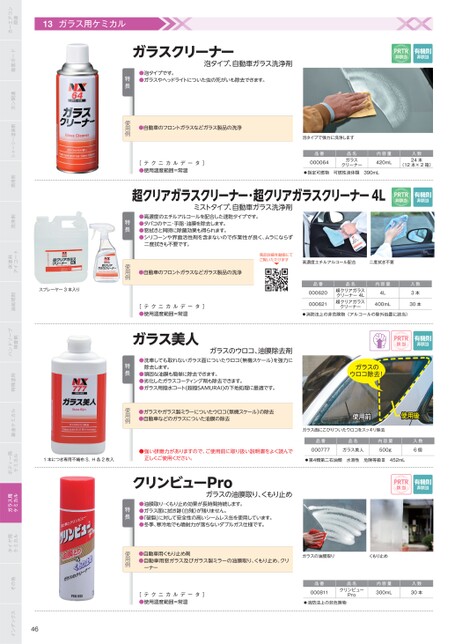 消防法上の非危険物(アルコールの除外処置に該当)PRTR該当有機則非該当ガラスのウロコ除去!使用前使用後ガラス面にこびりついたウロコをスッキリ除去品番品名000777ガラス美人内容量500g入数6個第4類第二石油類水溶性危険等級Ⅲ452mLPRTR該当有機則非該当●自動車のフロントガラスなどガラス製品の洗浄商品詳細を動画にてご覧いただけます高濃度エチルアルコール配合二度拭き不要タ]品番000620000621品名超クリアガラスクリーナー4L超クリアガラスクリーナー内容量4L400mL入数3本30本ガラスのウロコ、油膜除去剤●洗車しても取れないガラス面についたウロコ(無機スケール)を強力に●頑固な油膜も簡単に除去できます。●劣化したガラスコーティング剤も除去できます。●ガラス用撥水コート(超撥SAMURAI)の下地処理に最適です。除去します。特長ニクテ[デ●使用温度範囲=常温カルーガラス美人PRTR非該当有機則非該当泡タイプ、自動車ガラス洗浄剤●泡タイプです。●ガラスやヘッドライトについた虫の死がいも除去できます。特長ガラスクリーナー●自動車のフロントガラスなどガラス製品の洗浄タ]泡タイプで強力に洗浄します品番000064品名ガラスクリーナー内容量420mL入数24本(12本×2箱)指定可燃物可燃性液体類390mLニクテ[デ●使用温度範囲=常温カルー超クリアガラスクリーナー・超クリアガラスクリーナー4LPRTR非該当有機則非該当ミストタイプ、自動車ガラス洗浄剤●高濃度のエチルアルコールを配合した速乾タイプです。●タバコのヤニ・手脂・油膜を除去します。●窓拭きと同時に除菌効果も得られます。●シリコーンや界面活性剤を含まないので作業性が良く、ムラにならず二度拭きも不要です。特長スプレーヤー3本入り●自動車用くもり止め剤●自動車用窓ガラス及びガラス製ミラーの油膜取り、くもり止め、クリーナーガラスの油膜取りくもり止めニクテ[デ●使用温度範囲=常温カルータ]品番000811クリンビュー品名Pro内容量300mL入数30本消防法上の非危険物ガラスの油膜取り、くもり止め●油膜取り・くもり止め効果が長時間持続します。●ガラス面に拭き跡(白残)が残りません。●「破裂」に対して安全性の高いシームレス缶を使用しています。●冬季、寒冷地でも噴射力が落ちないダブルガス仕様です。特長クリンビューPro●ガラスやガラス製ミラーについたウロコ(無機スケール)の除去●自動車などのガラスについた油膜の除去1本につき専用不織布S,H各2枚入●強い研磨力がありますので、ご使用前に取り扱い説明書をよく読んで正しくご使用ください。関連カーエアコン塩害ガードガン関連シャーシー塗装剤潤滑剤洗浄剤アイコート床塗料油処理剤検査剤ハンドソープ特殊塗料鈑金ケミカルケミカルボディー用ケミカルガラス用ケミカルタイヤ用その他インデックス46