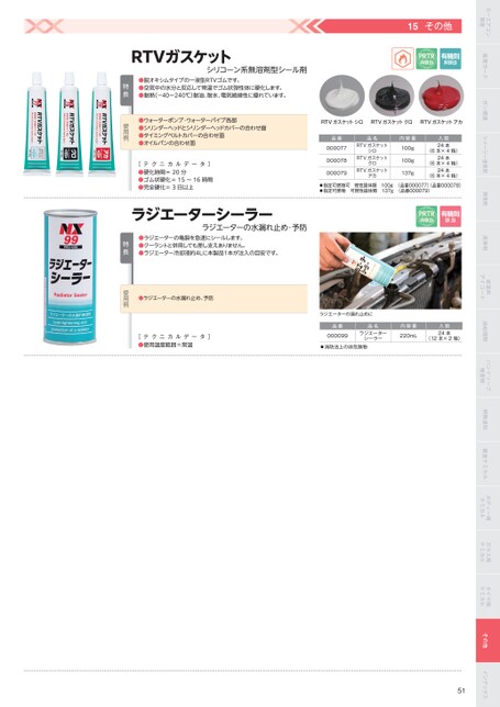 カーエアコン関連塩害ガードガン関連シャーシー塗装剤潤滑剤洗浄剤床塗料アイコート油処理剤ハンドソープ検査剤特殊塗料鈑金ケミカルボディー用ケミカルガラス用ケミカルタイヤ用ケミカルその他インデックスPRTR非該当有機則非該当RTVガスケットシロRTVガスケットクロRTVガスケットアカ品番000077000078000079RTVガスケットRTVガスケットRTVガスケット品名シロクロアカ内容量100g100g137g入数24本24本24本(6本×4箱)(6本×4箱)(6本×4箱)指定可燃物可燃性固体類100g(品番000077)(品番000078)指定可燃物可燃性固体類137g(品番000079)PRTR非該当有機則該当シリコーン系無溶剤型シール剤●脱オキシムタイプの一液型RTVゴムです。●空気中の水分と反応して常温でゴム状弾性体に硬化します。●耐熱(-40〜240℃)耐油、耐水、電気絶縁性に優れています。特長RTVガスケット●ウォーターポンプ・ウォーターパイプ各部●シリンダーヘッドとシリンダーヘッドカバーの合わせ面●タイミングベルトカバーの合わせ面●オイルパンの合わせ面タールカニクテ[デ●硬化時間=20分●ゴム状硬化=15〜16時間●完全硬化=3日以上]ラジエーターシーラーラジエーターの水漏れ止め・予防●ラジエーターの亀裂を急速にシールします。●クーラントと併用しても差し支えありません。●ラジエーター冷却液約4Lに本製品1本が注入の目安です。特長●ラジエーターの水漏れ止め、予防ラジエーターの漏れ止めにニクテ[●使用温度範囲=常温カルデータ]品番000099品名ラジエーターシーラー消防法上の非危険物内容量220mL入数24本(12本×2箱)51