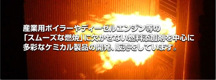 この事業部のメイン商品は燃料添加剤です。電力会社の火力発電所、民間会社の自家発電等の発電用ボイラーをターゲットとし、バイオマス燃料、重油燃焼によるボイラー炉内の汚れ防止、大気汚染物質(NOx,煤塵)の抑制、又ディーゼルの黒煙防止、燃焼効率向上等に効果を発揮します。そして最近では、原油価格高騰により燃料の見直しがなされ、バイオマス、石炭、石油コークス、高粘度残渣油などが使用されて来ており、これらの燃料による種々の障害に対しても十分に対応できる技術と製品群を備えております。その他にも製紙会社や鉄鋼会社等、様々な業種に対応した工業薬品の製造販売をしております。